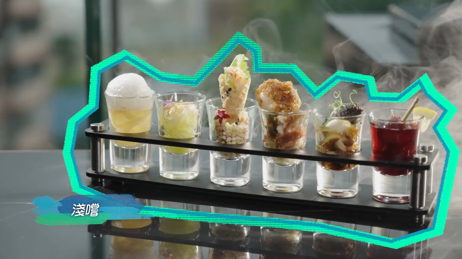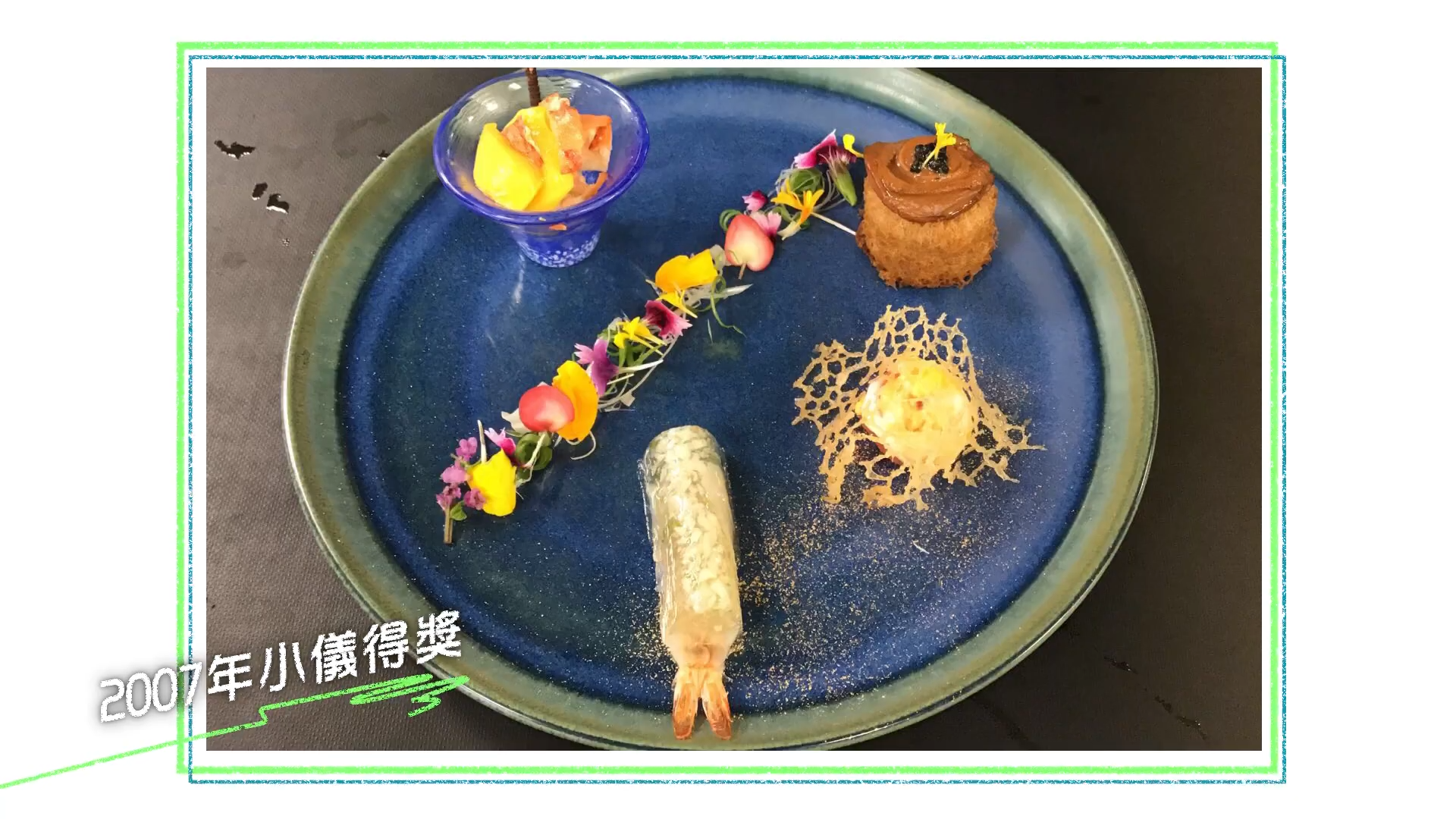 她分享其中一個電視節目,要以「香港美食」為主題創作美食。此時,她想起一個街道名--「蘭桂坊」,「果到出名紅酒、酒類,於是諗一道菜叫『淺嚐』,一次過頭盤做6 SET酒精,有啤酒、清酒、紅酒、茅台、陳年花雕」。這道「淺嚐」,包括清酒花蟹萵筍絲、啤酒花膠啫喱凍、陳年花雕燒遼參、勃根地慢煮白玉、茅台藤椒墨魚仔、干邑龍蝦沙律筍,意念十分創新。![]()