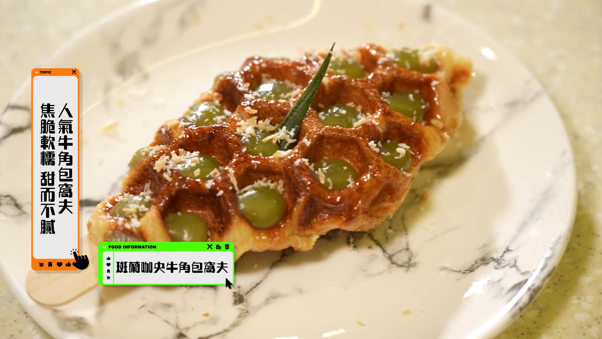 斑蘭咖央牛角包窩夫,表面灑上了椰絲和椰子脆脆,「口感好得意,唔會太甜。」
