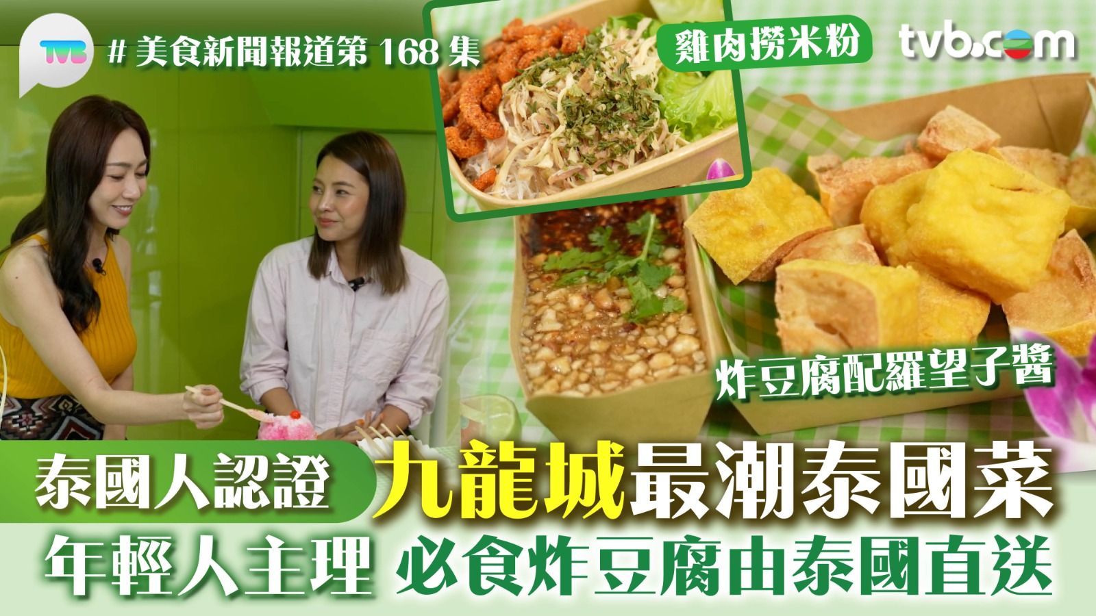《美食新聞報道》今集由居港泰國人Aimee帶主持黃嘉雯(Carmaney)帶路歎九龍城正宗泰國菜。餐廳由年輕人主理,由店內設計到菜單都極具創新。必食招牌香脆炸豆腐配羅望子醬、食材由泰國直送,外脆內軟的豆腐配上帶有花生碎的羅望子醬料,酸甜開胃。泰式豬肉沙嗲配麵包,首先品嚐沙嗲泰式豬肉,佐以南亞地區常見的漬物阿扎(Achar),令兩位食慾大開。雞肉撈粉同樣值得一試,米粉彈牙留香,加上冬蔭味的炸豬皮,增添不同層次。