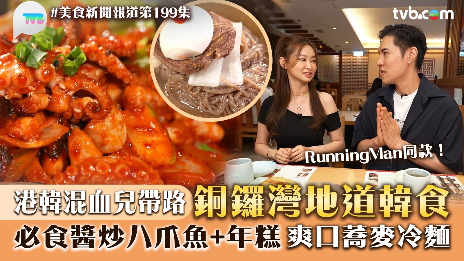 《美食新聞報道》今集由伍倩彤(Gillian)與居港韓國人李明憲(Aki)去銅鑼灣品嚐正宗韓式料理。餐廳擁有逾30年歷史,由韓國人主理。Aki推介店內必點辣炒年糕,口感煙韌。韓國年糕有圓片狀和條狀之分,兩者有不同的寓意,圓片象徵財運,條狀則寓意長壽。醬炒八爪魚,色澤誘人令人食慾大增,八爪魚Q彈多汁,配料豐富!自製蕎麥麵,醋和芥辣可謂點睛之筆,提升整體風味之餘,清新又開胃!