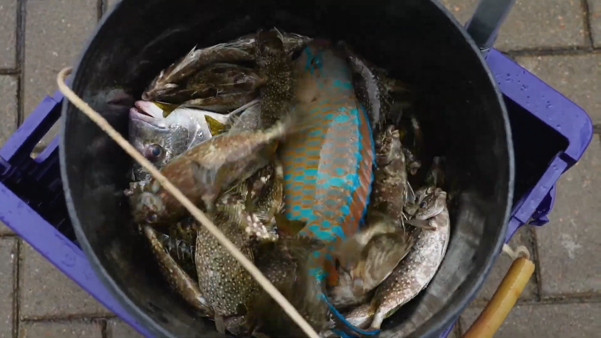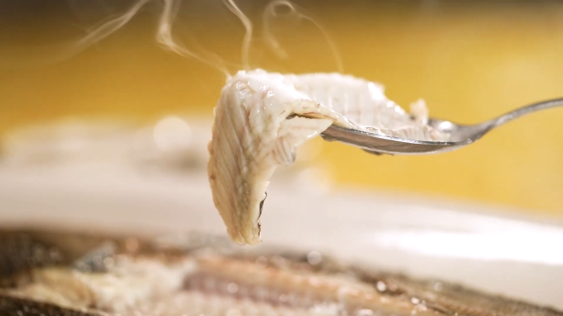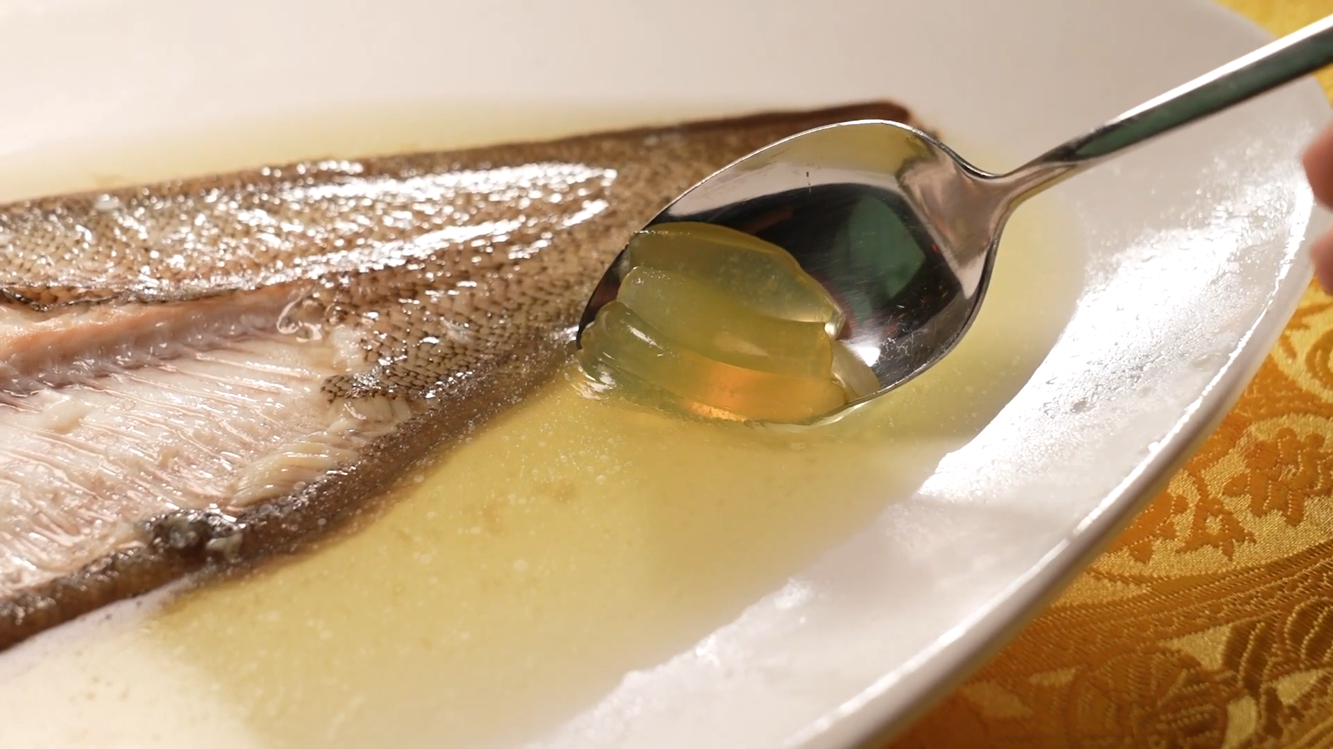 潮味魚,因為輝嫂是潮州人,這道菜混合了將蜑家和潮州的煮法。輝嫂指:「醃完就咁蒸,食原味,熱嘅魚飯。清洗好魚後放上鹽,放10分鐘,再沖水,再拎去蒸9分鐘,放一陣啲魚水會變成啫喱狀,起哂膠,食落去好煙韌。暖食又得攤凍食又得,變咗潮味魚。」![]()