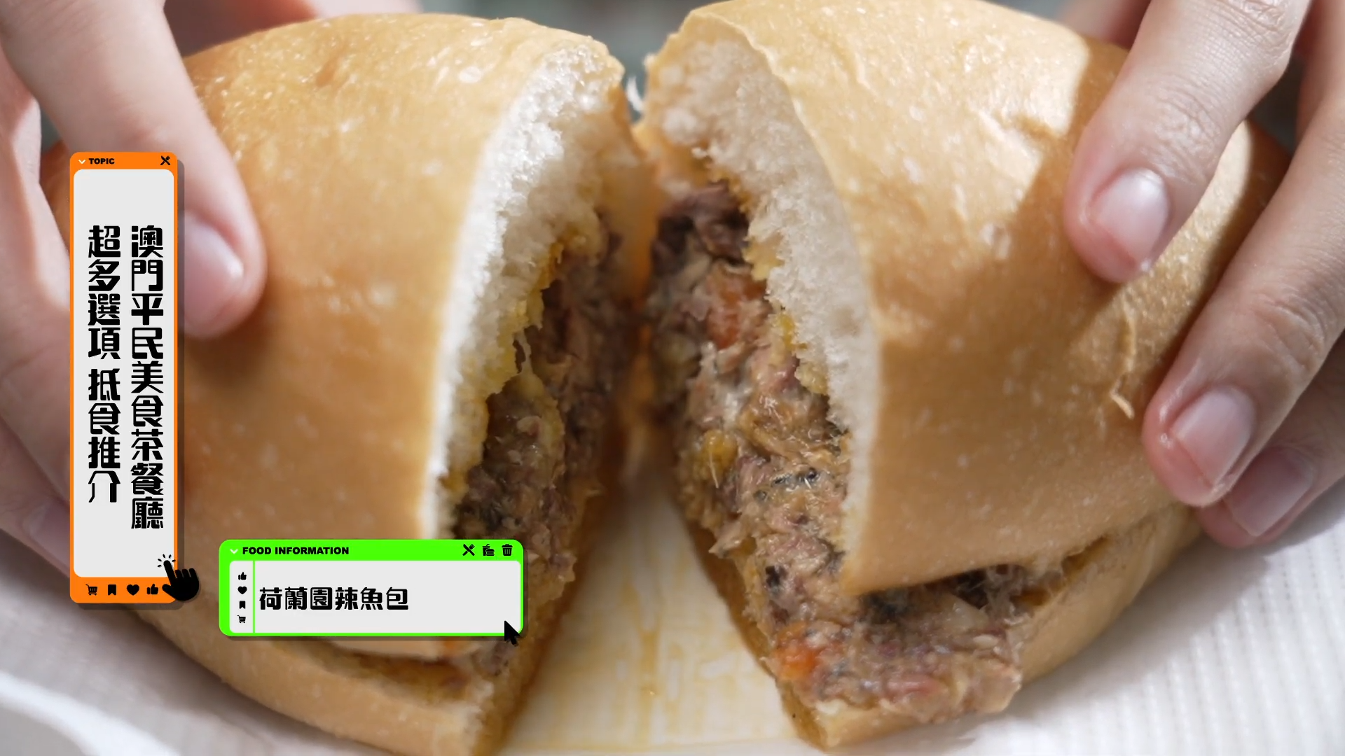 她亦試了澳門辣魚包,在試食,Karen分享澳門辣魚包有兩個版本,「第一個版本係包夾住原條沙甸魚,第二個版本就係呢個法荷蘭園辣魚包,佢就係咖哩粉加碎魚肉,好足料,好多沙甸魚,而且仲係熱辣辣,好好食。」![]()