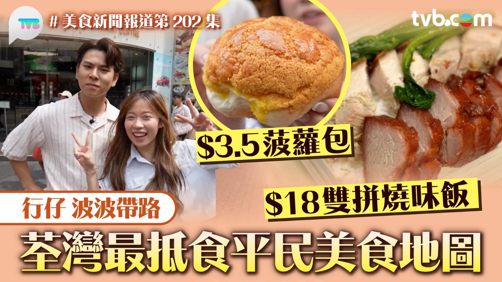《美食新聞報道》全新環節「荷包守衛隊」,由蔡景行(行仔)孖黃婧靈(波波)帶大家食盡至便美食!荃灣最便麵包店,大受街坊歡迎的招牌菠蘿包日賣千零個,只需港幣3.5元即能享用,行仔分享小貼士:「麵包不定時持續出爐,每盤新鮮即焗即出,賣完一盤再出一盤」,而提子包更勾起行仔的童年記憶:「就係我細細個時候,喺樓下間麵包舖食嗰個提子包嘅味!」。蒜蓉包微焦,蒜蓉香及牛油香勁濃郁。20蚊有找食燒味雙拼?餐廳位於荃灣新村街,叉燒燒肉飯和切雞燒鴨飯,肉質鮮嫩,油香突出,CP值爆表!