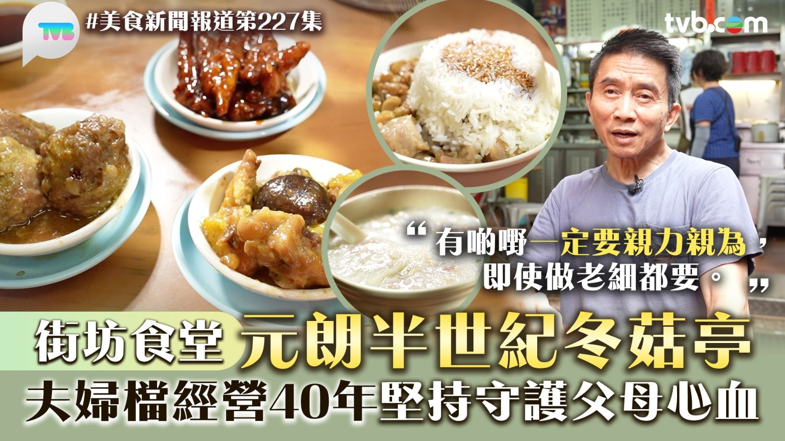 《美食新聞報道》今集帶大家去元朗品嚐「冬菇亭」的懷舊味道!老闆張先生與太太經營小店40年,他分享小店由父母一輩傳落,初期只賣粥品到現時加入盅頭飯、點心,一直深受街坊支持。但張先生直言初時不願接手,因不捨父母心血被浪費,最終將一生奉獻給小店。而小店開業逾半世紀,出品都由老闆親力親為,即使辛苦亦堅持到底,除了是想守住父母心血,更因想守住香港人的集體回憶,令更多街坊品嚐到「香港嘅味道」。