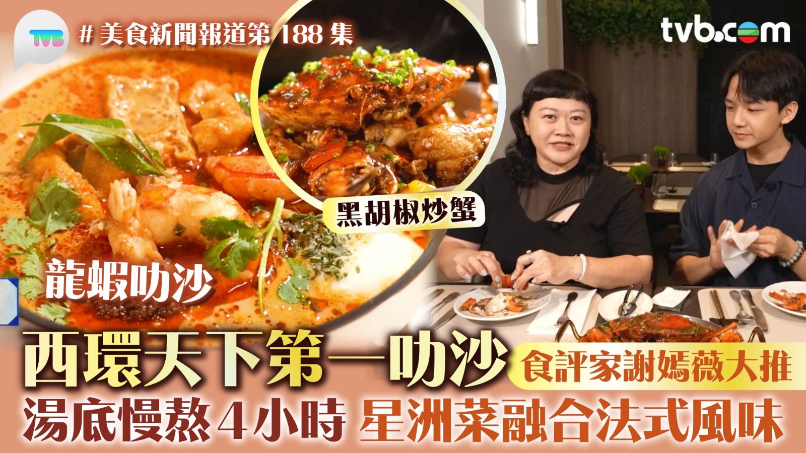 《美食新聞報道》今集食評家謝嫣薇(Agnes)與主持人施焯日(Arthur)一起帶你體驗由靚仔名廚主理,融合法式風味的新加坡菜。Agnes首推黑胡椒炒蟹,兩位主持均對其讚不絕口:「活蟹新鮮彈牙,黑椒汁辛辣入面有一絲溫柔,鮮到不得了,米粉更加係『天上人間』!」餐廳另一道必食招牌「龍蝦叻沙」,被Agnes稱為「天下第一叻沙」。用龍蝦殼及南洋香料慢火熬製四小時的湯底香氣四溢,「摻摻」完美融合了米粉及油麵,也加入了自製叄巴辣醬。炭燒沙嗲雞飯,採班蘭珍珠飯,香氣濃郁,口感軟糯。