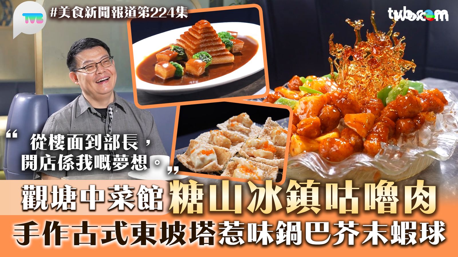 今集《美食新聞報道》有由餐廳樓面起家,靠與熟客的感情,獲打本開舖變身老闆的連哥,他自言會把每個客人當成朋友與家人,賓至如歸!說到餐廳名菜,首先有「冰鎮咕嚕肉」,菜式選取豬頸肉做成,就算是冰鎮口感,上菜亦無損咕嚕肉脆身口感,菠蘿極為新鮮,入口香甜。醬汁亦加入山楂片、陳皮粉,衝擊顧客味蕾!另一道手工菜「古式東坡塔」,工序非常繁複,切薄亦非常講究師傅刀工,除了賣相精緻之外,更是入口即溶,香味溢出;至於「鍋巴芥末蝦球」,炸的過程講求油量控制,用180度的高溫油炸4分鐘,醬料更混合沙律醬、青檸汁、芥末和煉奶,極不簡單!