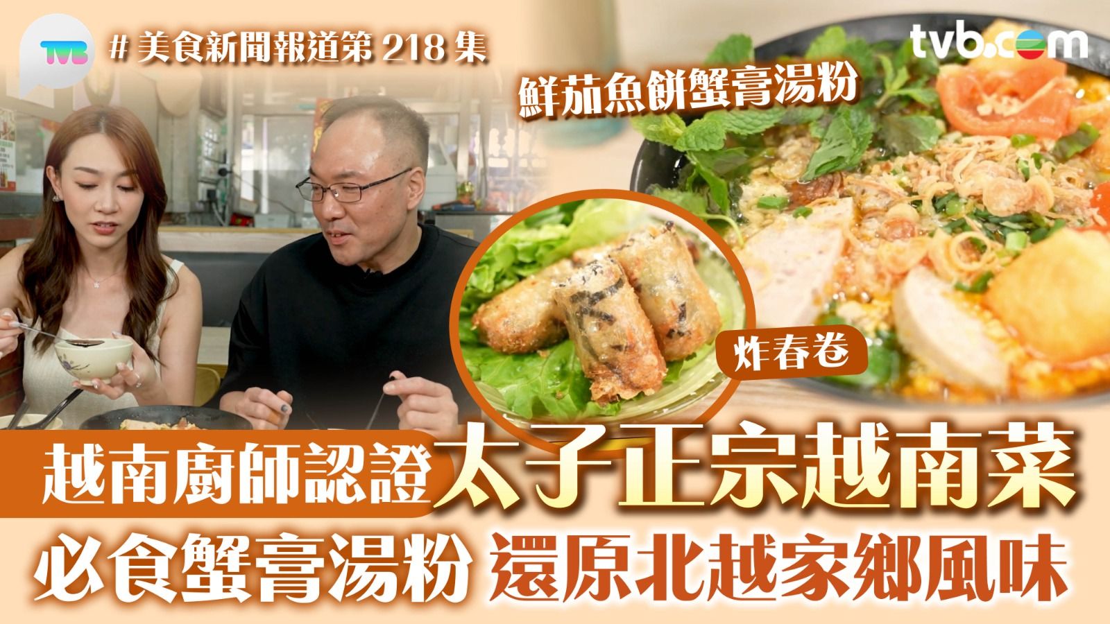 《美食新聞報道》今集由越南廚師Danny帶路去太子,品嚐他的家鄉北部海防的正宗越南菜!必食鮮茄魚餅蟹膏湯粉,雞湯底清甜,蛋花加入蟹膏更顯鮮味,看家製手打魚餅惹味十足。炸春卷薄脆餡足,用新鮮香葉、生菜包住食,爽口不油膩。木瓜沙律加入扎肉同花生,清新帶微辣酸甜開胃。Danny仲話餐廳食材全由越南直送,味道同北越家鄉一模一樣,大讚「食到媽媽嘅味道」!