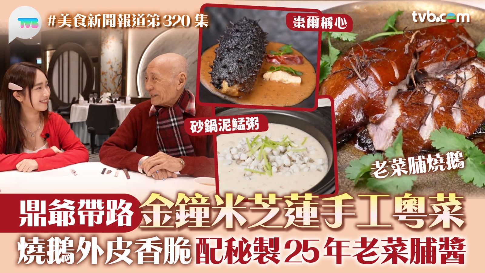 《美食新聞報道》今集林映暉(暉哥)帶鼎爺去金鐘試星級手工粵菜!必食招牌「老菜脯脆皮燒鵝」,菜式用3款不同年份的菜脯烹煮,增加味道層次,搭配25年老菜脯醬,皮脆肉嫩兼有鹹香味。第二道菜「棗爾稱心」,以遼參內釀入雞茸同鹿筋,工序繁複,口感爽彈。最後試品嚐「砂鍋泥鯭粥」,用魚骨熬湯再加深水泥鯭肉,鮮甜綿密。鼎爺還教路煮泥鯭千萬不能落薑,否則會變臭!