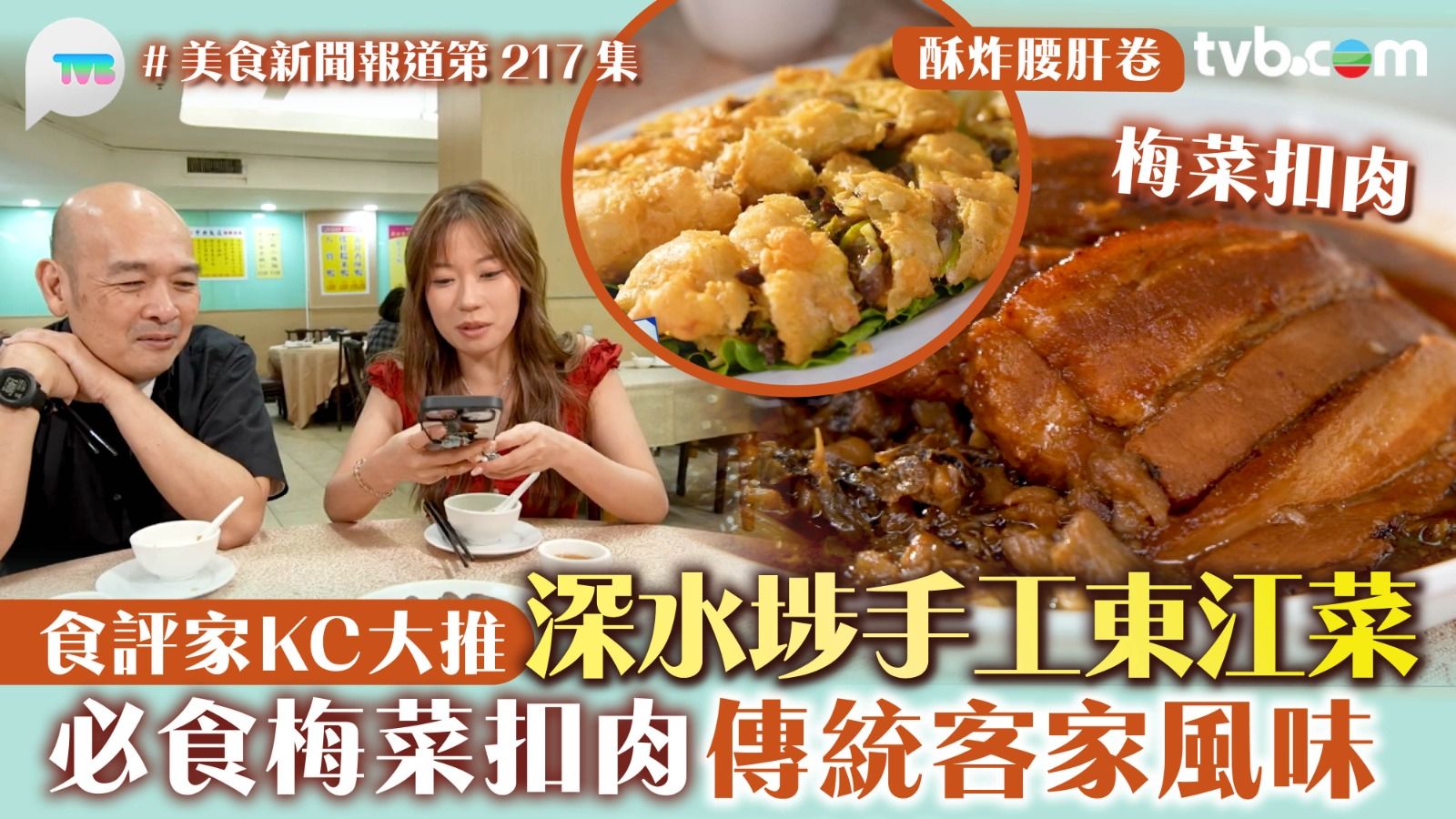 《美食新聞報道》今集由身為客家人的KC,帶波波去深水埗食手工東江菜,品嚐家鄉味道!荔芋香酥鴨外皮酥脆,綿密芋泥包住鴨肉絲,滋味十足。酥炸腰肝卷以腐皮包裹韭黃、豬潤及豬腰等,外皮香口餡料濕潤,層次豐富。還有東江菜必食菜式梅菜扣肉,五層肥瘦腩肉炸完再加入甜梅菜炆煮,軟嫩入味入口即融,配上白飯更是完美的配搭!