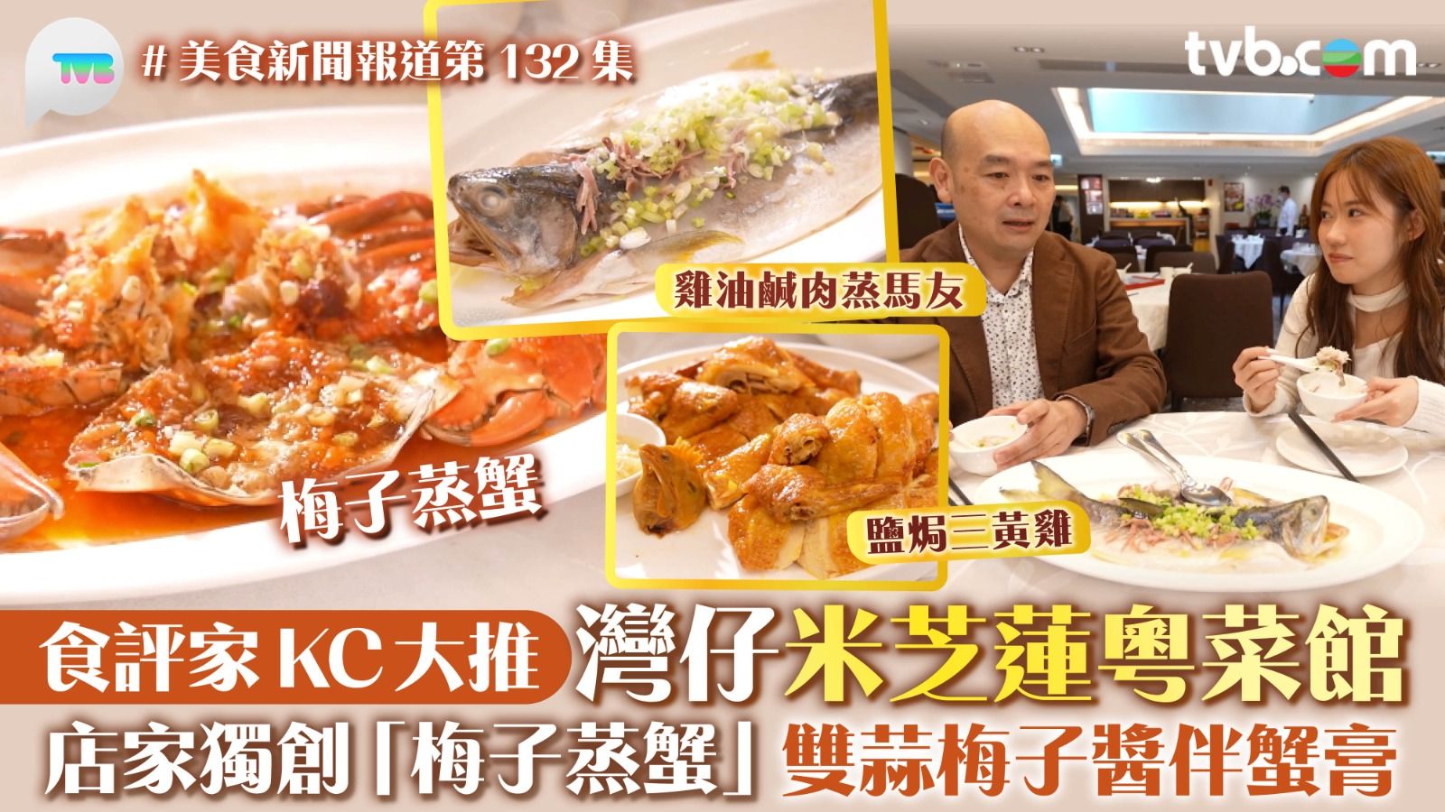 今集《美食新聞報道》由知名食評家KC Koo帶主持波波黃婧靈到灣仔覓食!餐廳入選米芝蓮推介,必食雞油鹹肉蒸馬友,馬友因其油脂豐富香濃,常被製成鹹鮮口味的佳餚,鹹肉的鹽分滲入魚肉之中,突出馬友的天然鮮甜,波波食過之後「拍爛手掌」。招牌鹽焗雞,雞皮微焦,選用三黃雞,油脂豐富。還有老闆母親創立的菜式雙蒜梅子蒸蟹,四時皆用不同的蟹製作,加上清甜梅子以及滿滿的蟹膏,送飯一流。