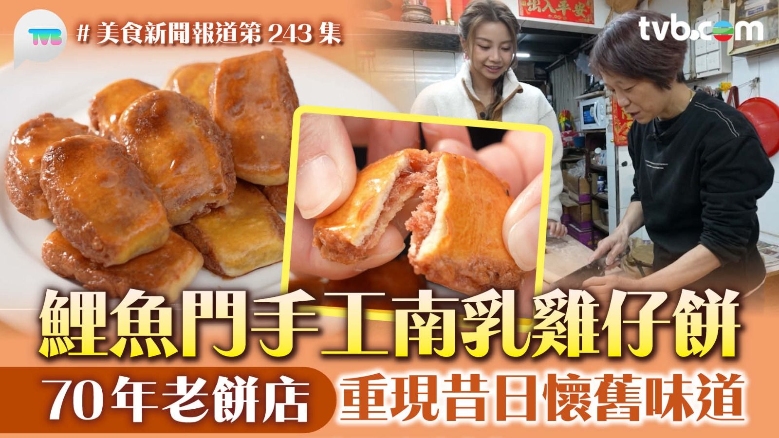 《美食新聞報道》今集何泳芍(Honey)到訪鯉魚門一間開業超過70年的老餅店,由羅小姐與兩位姊妹從父母手中接力經營。招牌南乳雞仔餅堅持手工製作,皮薄餡足,南乳味濃。羅小姐指材料愈自然愈好食,所以雞仔餅不會加任何添加劑。直到現時三姊妹仍一直記住媽媽的心願,多年保持親民價錢,希望將這份懷舊味道留給更多街坊品嚐。