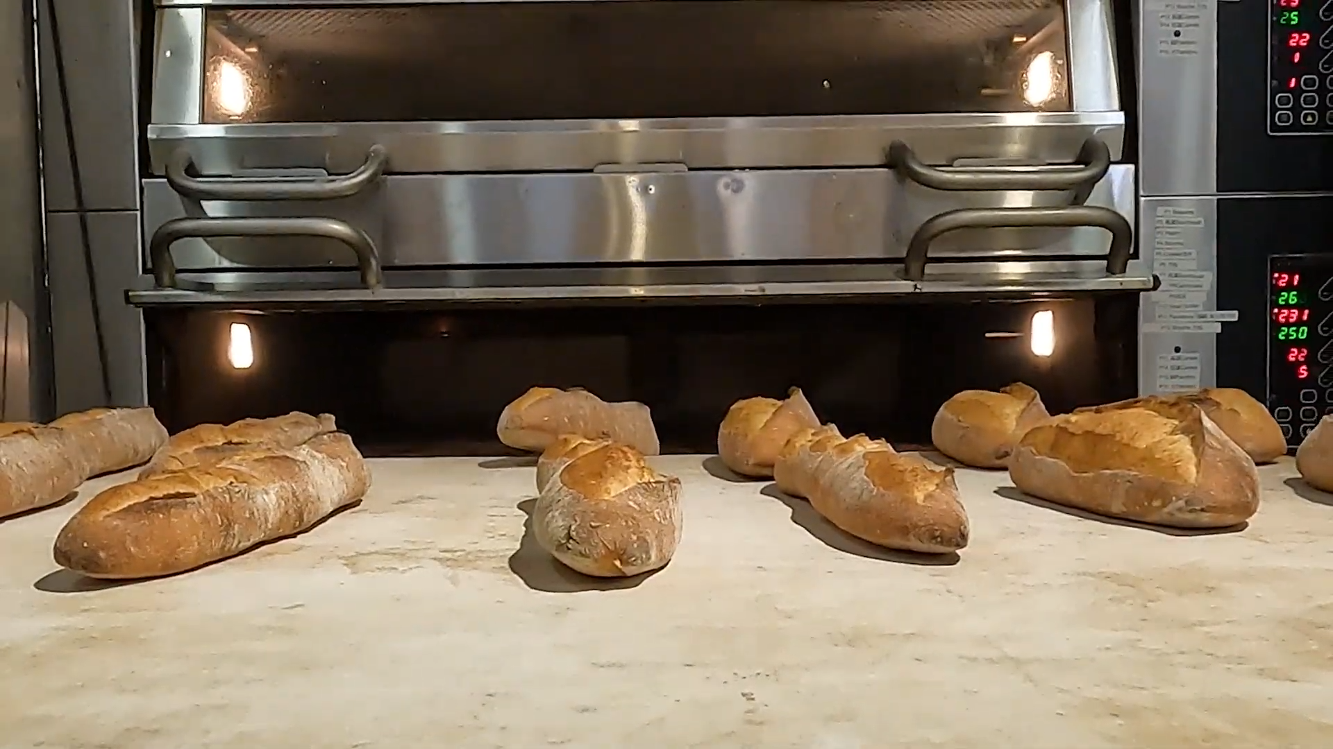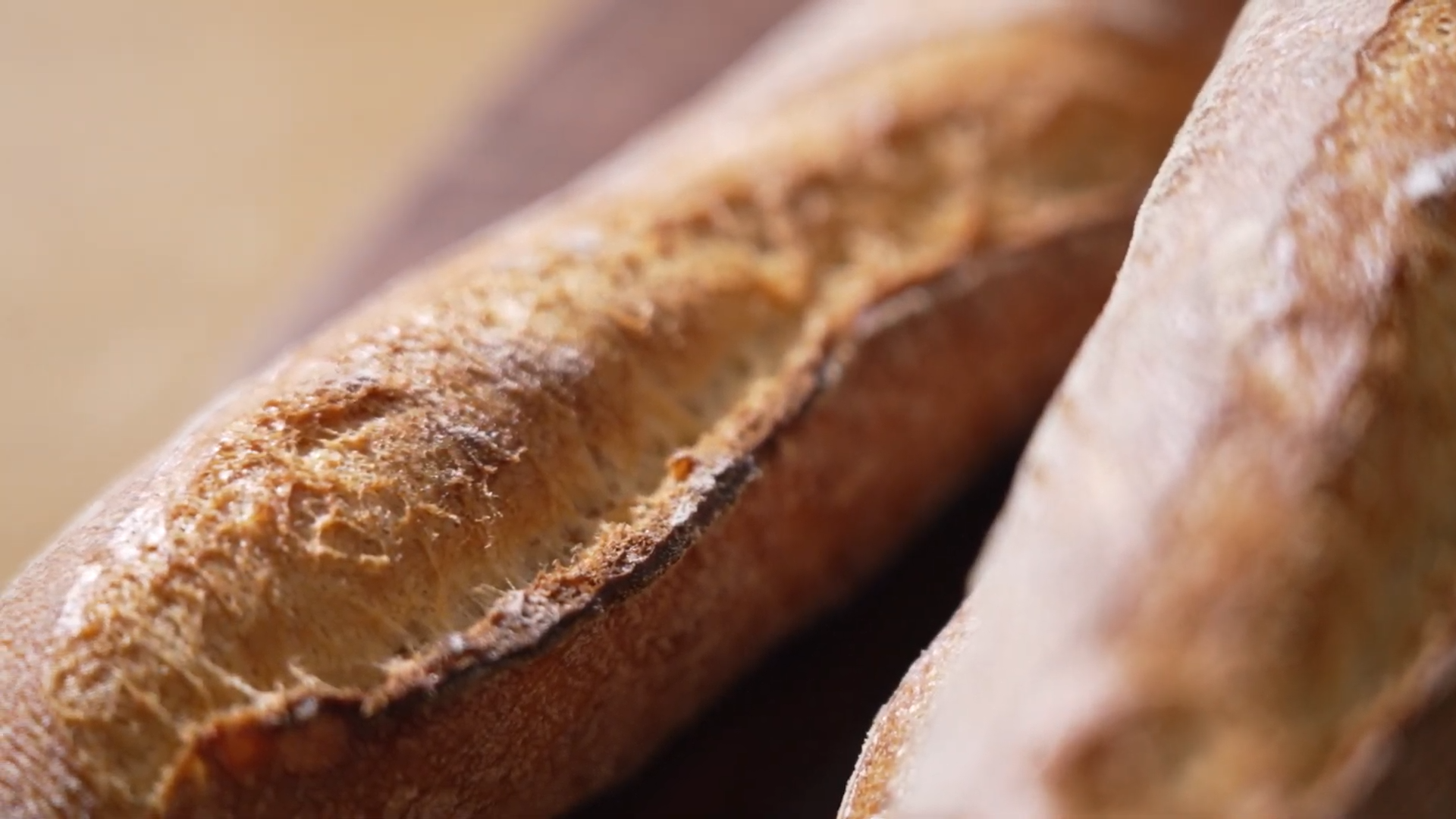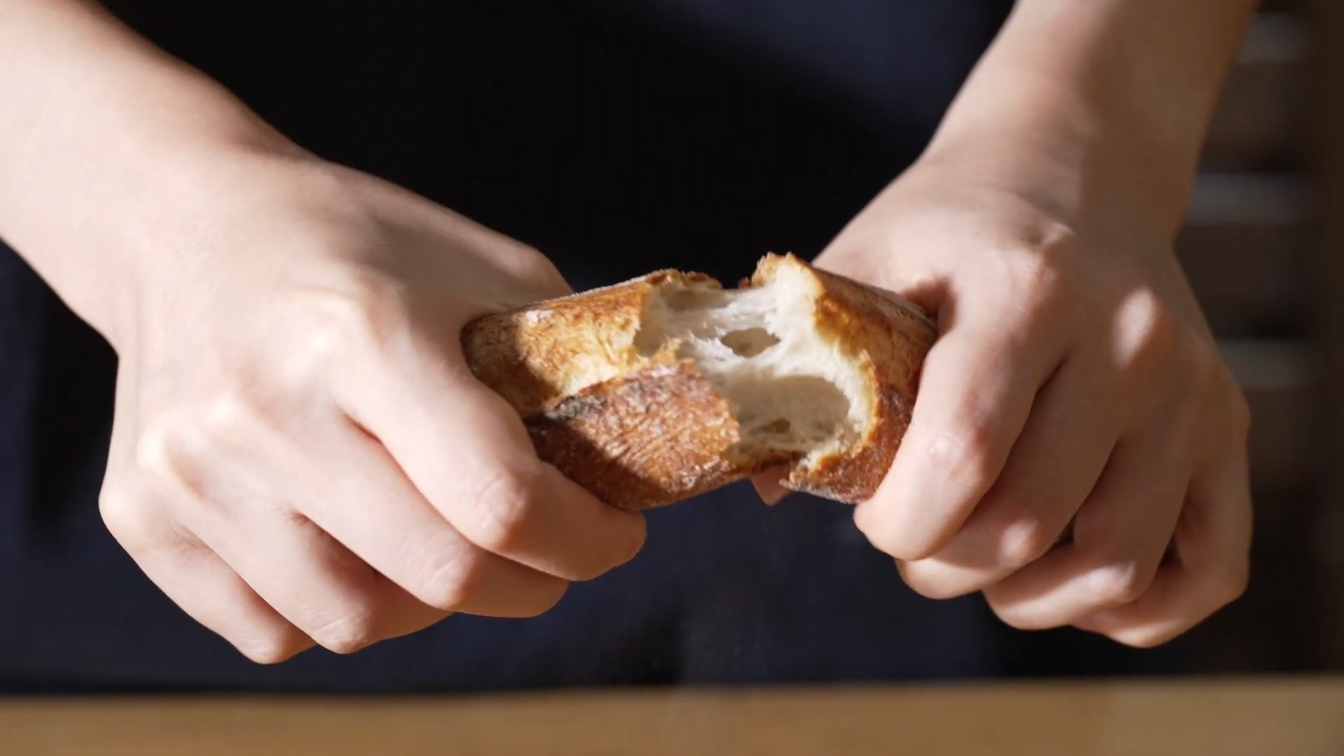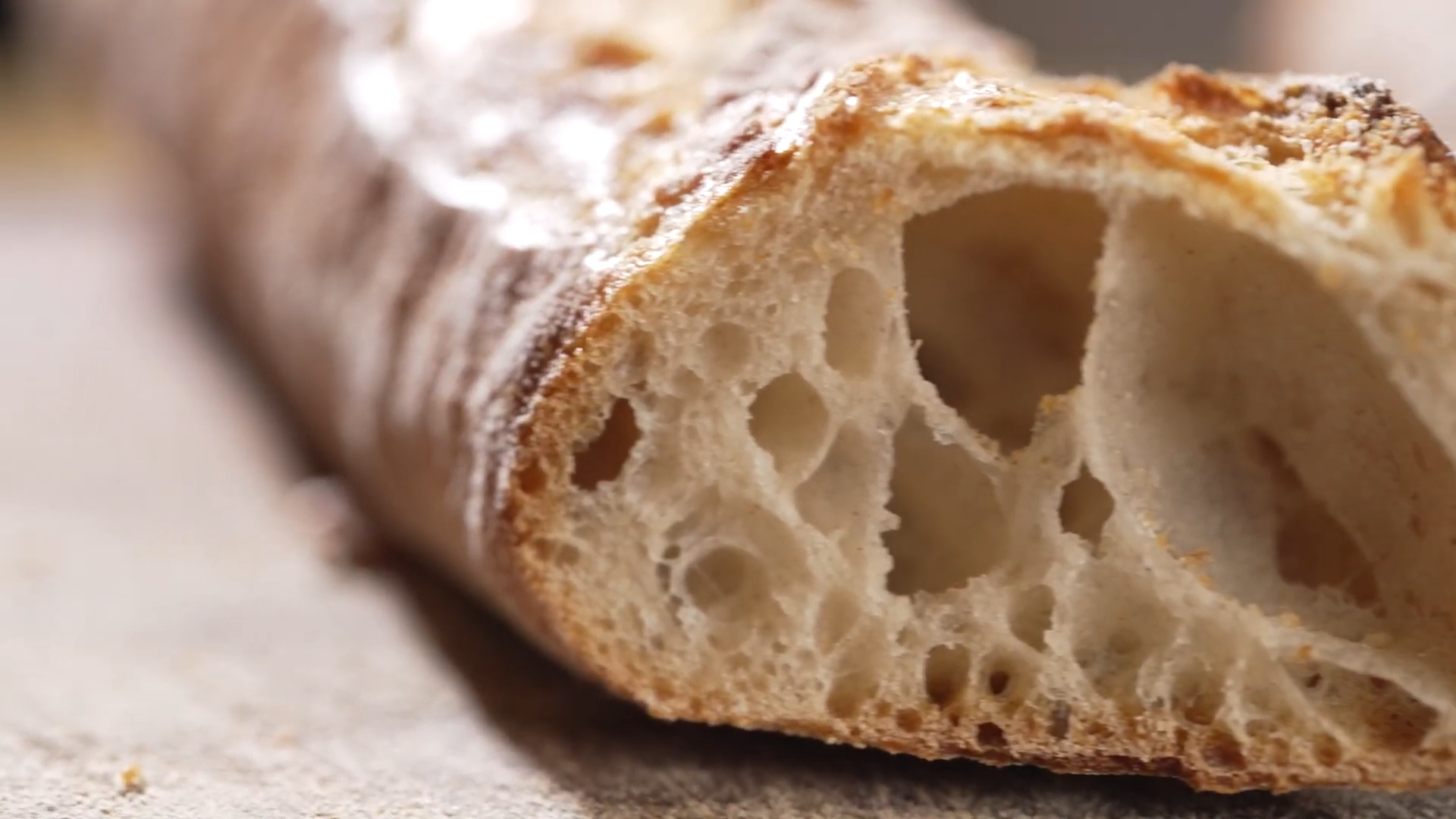 市面上,有好多法包,我們怎樣知道何謂一個好的法包呢?KC表示:「我自己有兩個定義,食到小麥粉原味,皮似餅乾咁脆,係對法包嘅要求。法包太粗會影響傳熱,焗時影響佢膨脹,皮未必做到餅乾咁脆效果。色澤方面,佢應該係深褐色,焦糖化嘅顏色,起碼個麵粉有足夠長嘅時間,喺發酵同分解過程,製造麥芽糖出嚟。」另外,我們也可以透過切開麵包後的狀態去了解,如果垂直切開,見到一至兩個由下向上升的大氣泡就最理想。而當打橫切開時,皮下有大氣泡,就是最脆的位置。![]()