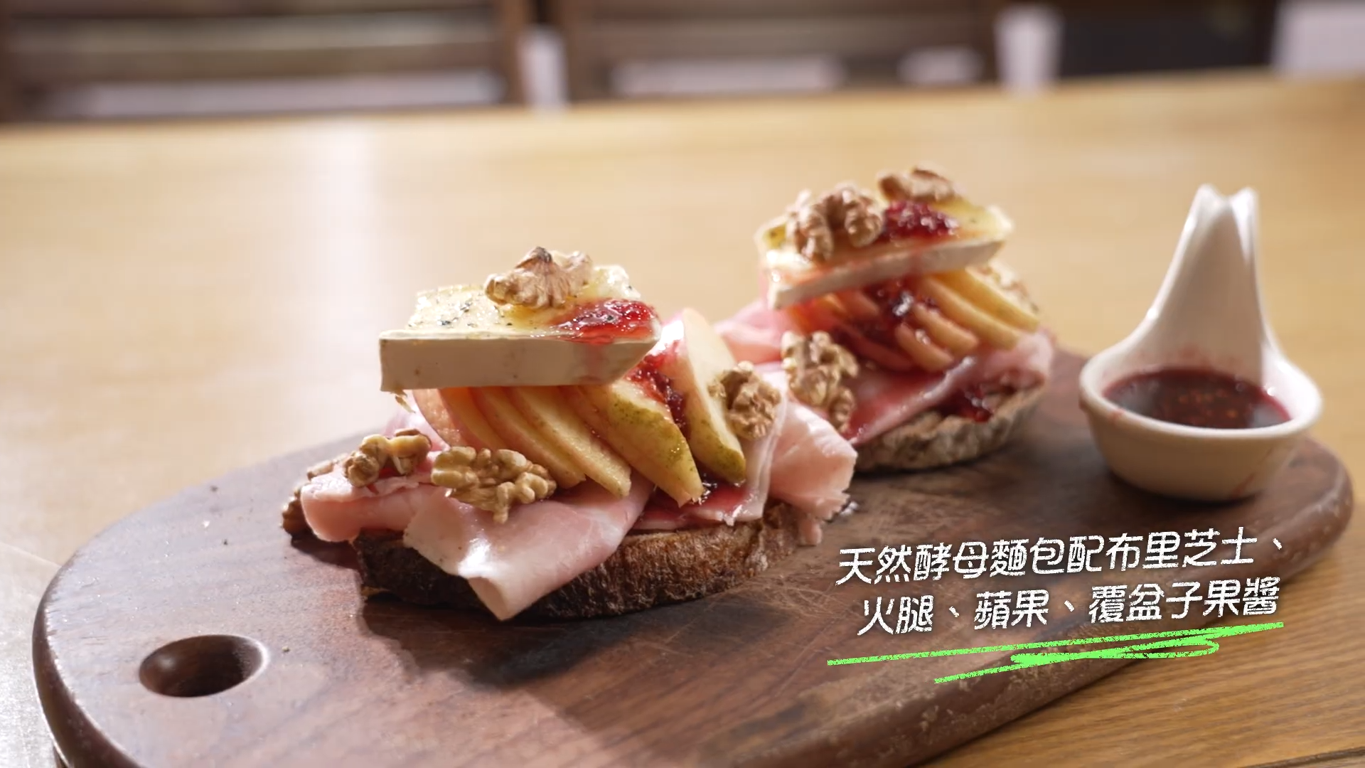 以下是麵包店的皇牌,材料有天然酵母麵包配布里芝士、火腿、蘋果、覆盆子果醬,蘋果的清甜可以讓有微鹹香的火腿,食落不會過膩,布里芝士可增加奶香,配合自家製覆盆子果醬,可以讓每啖甜味都有變化,味道變得豐富。