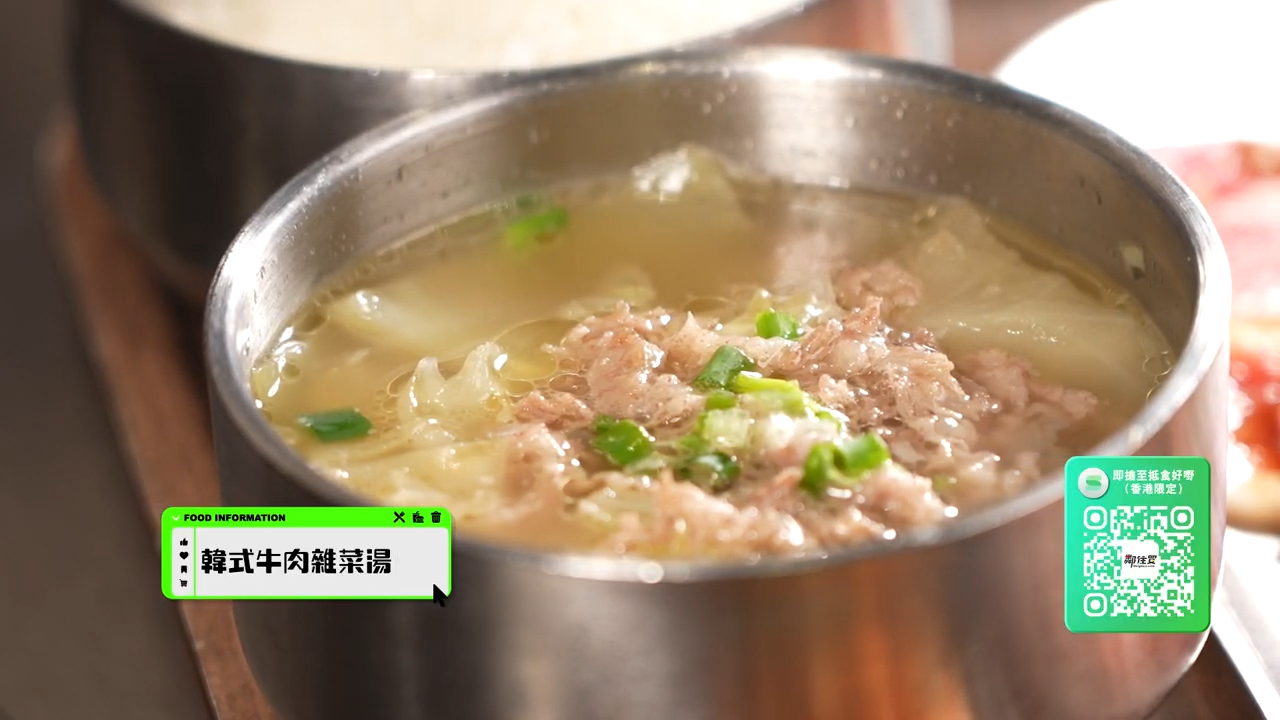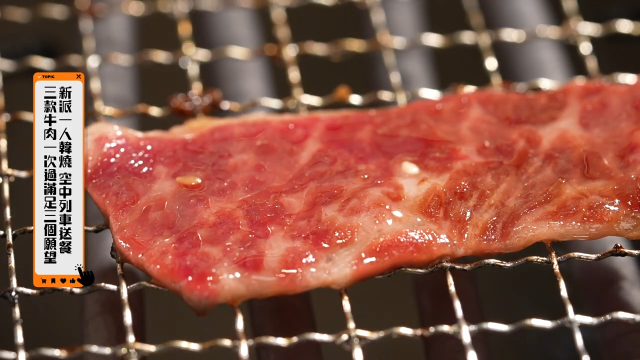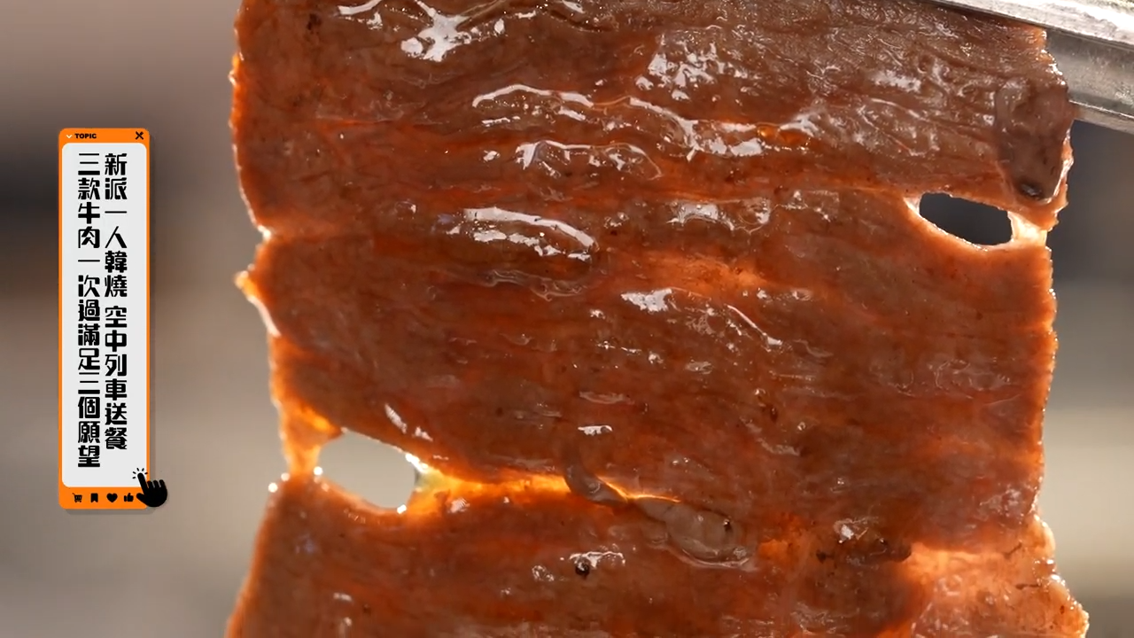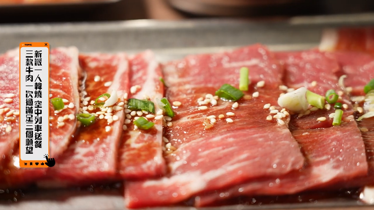 伍倩彤Gillian則帶大家體驗新派一人韓燒,只要用手機下單,美食將由空中列車送至餐桌,非常方便。Gillian選擇人氣牛肉三拼套餐,包含美國牛小排、肩胛牛柳以及美國牛五花。牛小排肥瘦相間,脂肪分佈均匀,肉質鮮嫩多汁,配上自家製七種不同的醬料,激發牛肉的香味。而肩胛牛柳肉質則更緊實,再加上韓式牛肉雜菜湯,剛好能夠舒緩油膩感。![]()