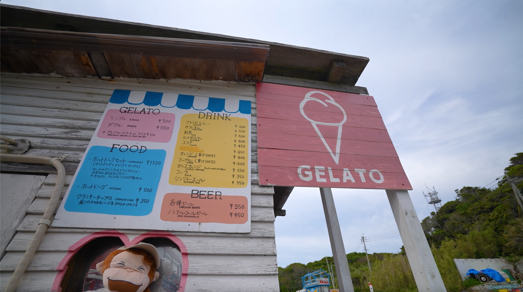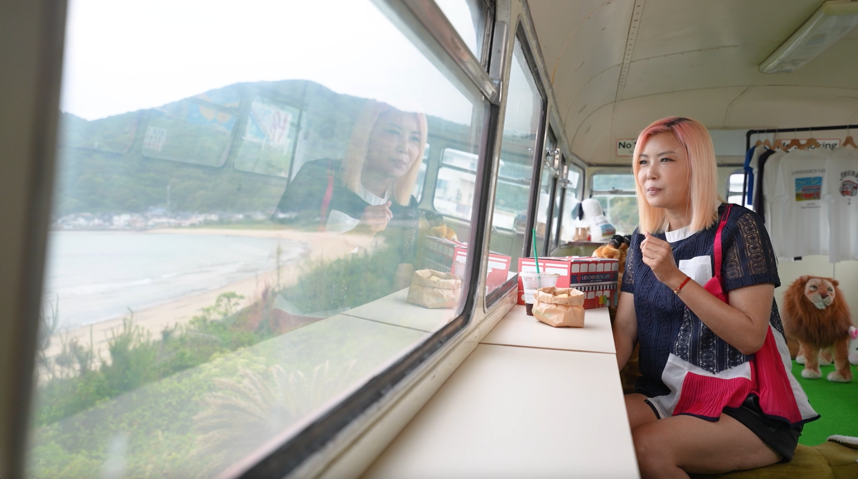 這架巴士曾在上世紀50年代時在倫敦行駛過,店主是特意從英國將它買下帶回日本進行改裝的。巴士的下面一層會售賣一些英式風格的T恤、杯等周邊產品,而上面一層空間則是提供給顧客享用美食,一邊食一邊望著無敵海景,心情自然愉悅。最值得一提的是,裡面的座位全部都是各式各樣的動物形態,地上則鋪上綠色地毯作草地,一上樓仿彿進入一個動物世界,非常得意。