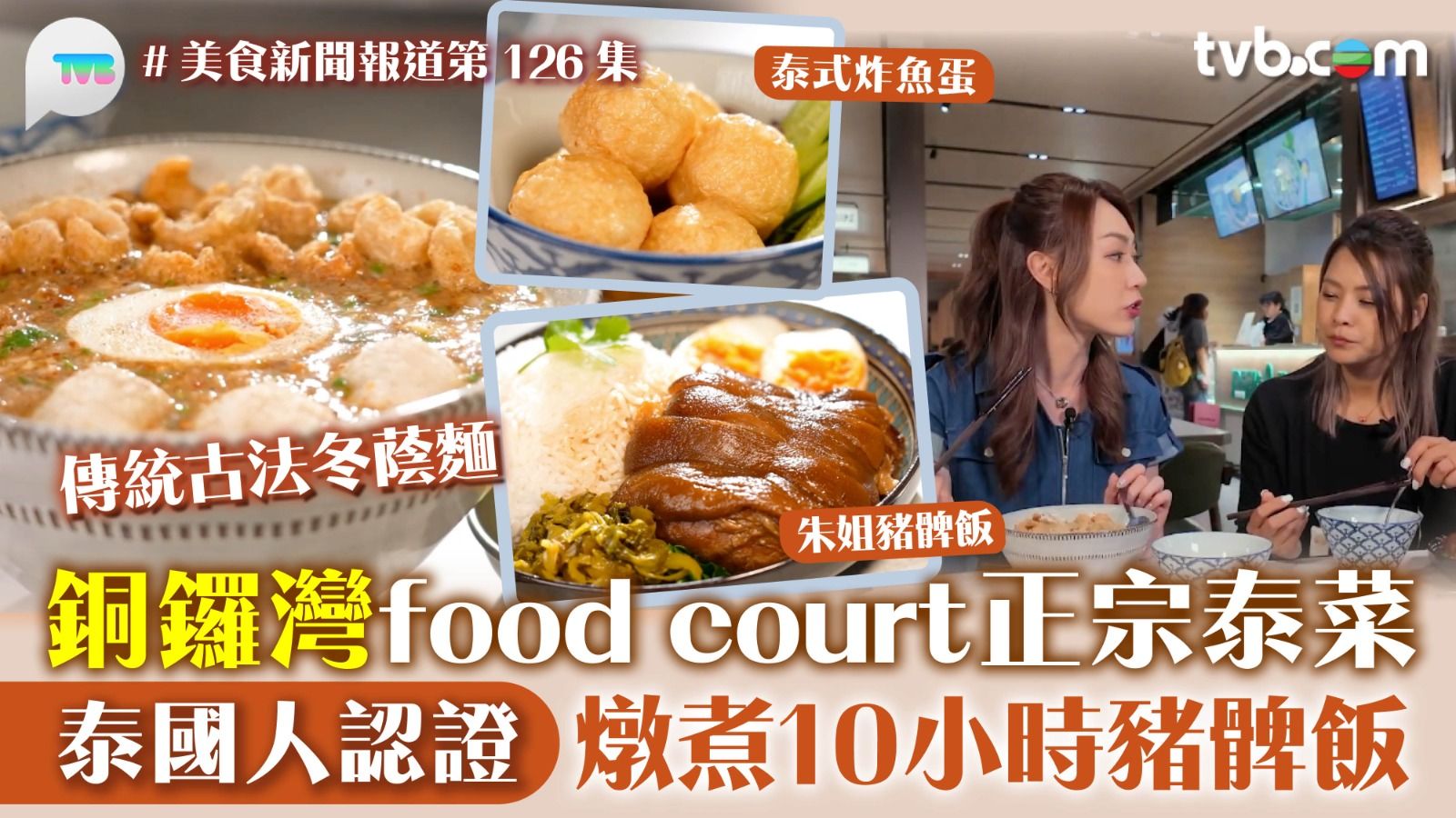 今集《美食新聞報道》由居港泰國Aimee帶主持黃嘉雯(Carmaney)到啓超道挖掘正宗泰國菜餐廳。常見的冬蔭功會加入蝦和草菇烹調,並以為魚露調味,而古法冬蔭麵則沒有蝦肉,以豬肉丸、蛋、花生碎、蝦米及炸豬皮等配料製作,青檸味突出,金邊粉吸滿湯汁的精華、爽口入味。烹調冬蔭功可加入椰奶或花奶,不加任何奶的稱為清冬蔭。Aimee必點小吃泰式炸脆魚蛋,配搭老闆用羅望子(又稱酸豆或酸果)自製的甜酸醬, 惹味十足。朱姐豬髀飯,豬髀燉煮10小時,豬皮軟糯Q彈,膠質滿滿,入口即融,配搭黃椒和醋的醬料食用,好吃到停不下來。
