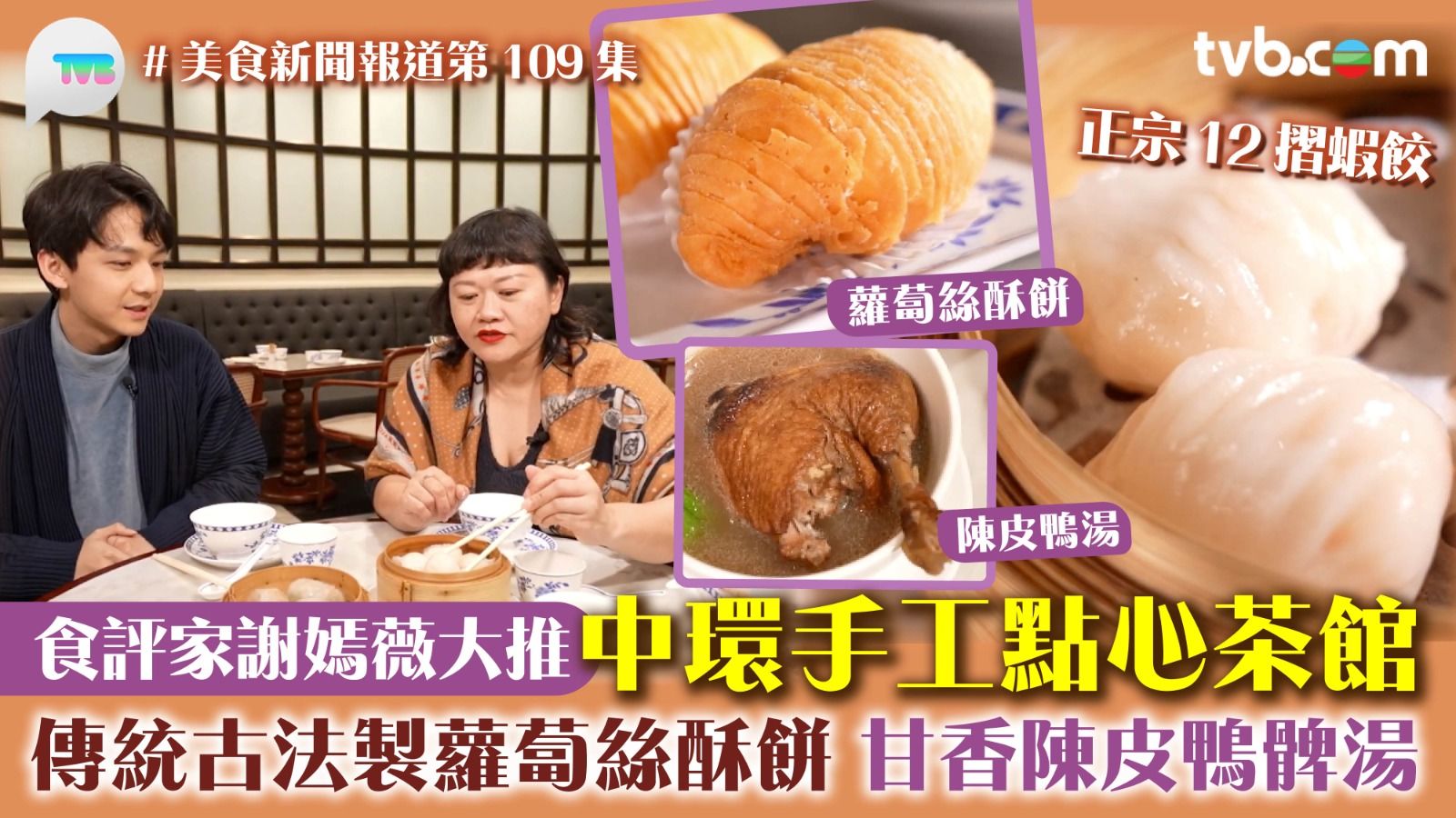今集《美食新聞報道》由自稱「將軍澳銀舌頭」的施焯日(Arthur),跟隨食評家謝嫣薇(Agnes)發掘地道美食!二人首站相約中環見面,靦腆的Arthur突然爆出一句:「你同我媽媽好似樣…….」,令Agnes一驚隨後即高EQ回覆:「係咪好有親切感。」於點心茶館落座後,Agnes點了蝦餃、香菇素菜餃以及陳皮鴨湯。Agnes分享靚蝦餃的三大標準,即皮薄餡靚、褶痕要夠清楚,正宗蝦餃通常有12-13個摺痕。她繼指現在不少點心師傅過分追求餃皮透明化,而靚的蝦餃皮需澄麵及生粉比例調配得好,不會過分透明且呈朦朧白色。