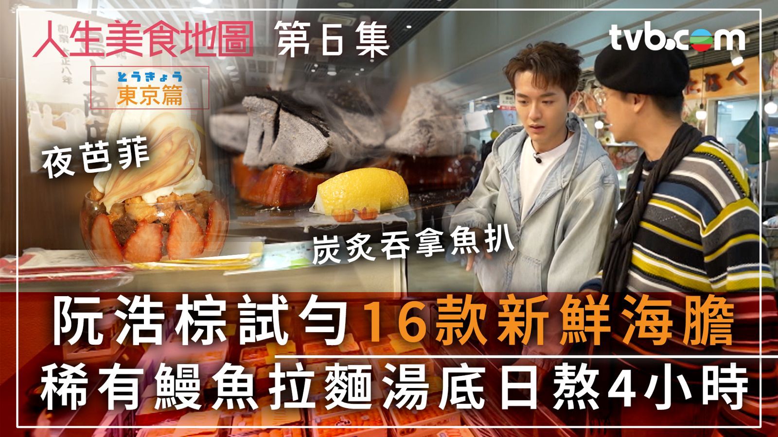 《人生美食地圖-東京篇》今晚(16日)播出的第六集,第二周出擊的由首次踏足日本的「人生美食家」阮浩棕,與陳方藤走進築地市場品嚐新鮮海膽、鰻魚拉麵,打卡炭炙吞拿魚扒、澀谷夜芭菲及體驗玩室內棒球。![]()