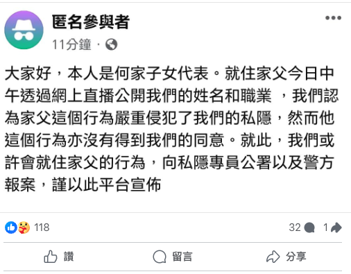 何伯在直播中亦細數五名子女「不孝」行經!「大仔何偉樑(音譯),2016年8月24號,攞咗我60萬,40萬支票,20萬現金。2016年3月24號,又取咗30萬買車,合共取咗我130幾萬。佢話咬糧畀返100萬我,但佢咬糧我打俾佢,佢話畀返50萬我,但佢唔聽我電話。」而二仔何偉文(音譯)裝修公屋時2013年取了他35萬,前後借了60多萬。更有疑似新何太爆料何伯大仔是警察高層,隨後自稱「何家子女」人士,在網上發聲直指何伯行為侵犯隱私,更宣布將報案:「就住家父今日中午透過網上直播公開我們的姓名和職業,我們認為家父這個行為嚴重侵犯了我們的私隱,然而他這個行為亦沒有得到我們的同意。就此,我們或許會就住家父的行為,向私隱專員公署以及警方報案。」