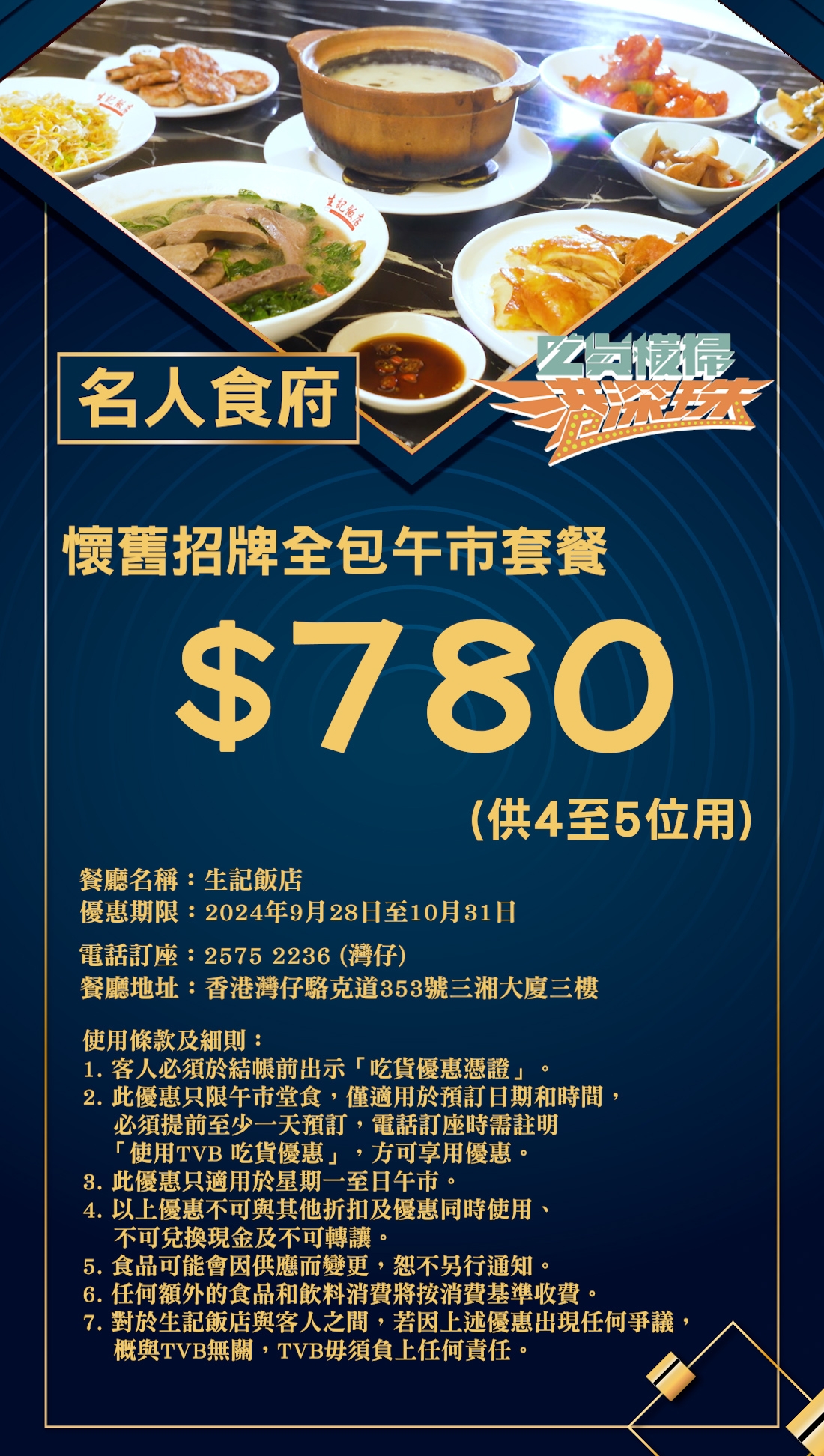 2. 此優惠只限午市堂食,僅適用於預訂日期和時間,必須提前至少一天預訂,電話訂座時需註明「使用TVB 吃貨優惠」,方可享用優惠。