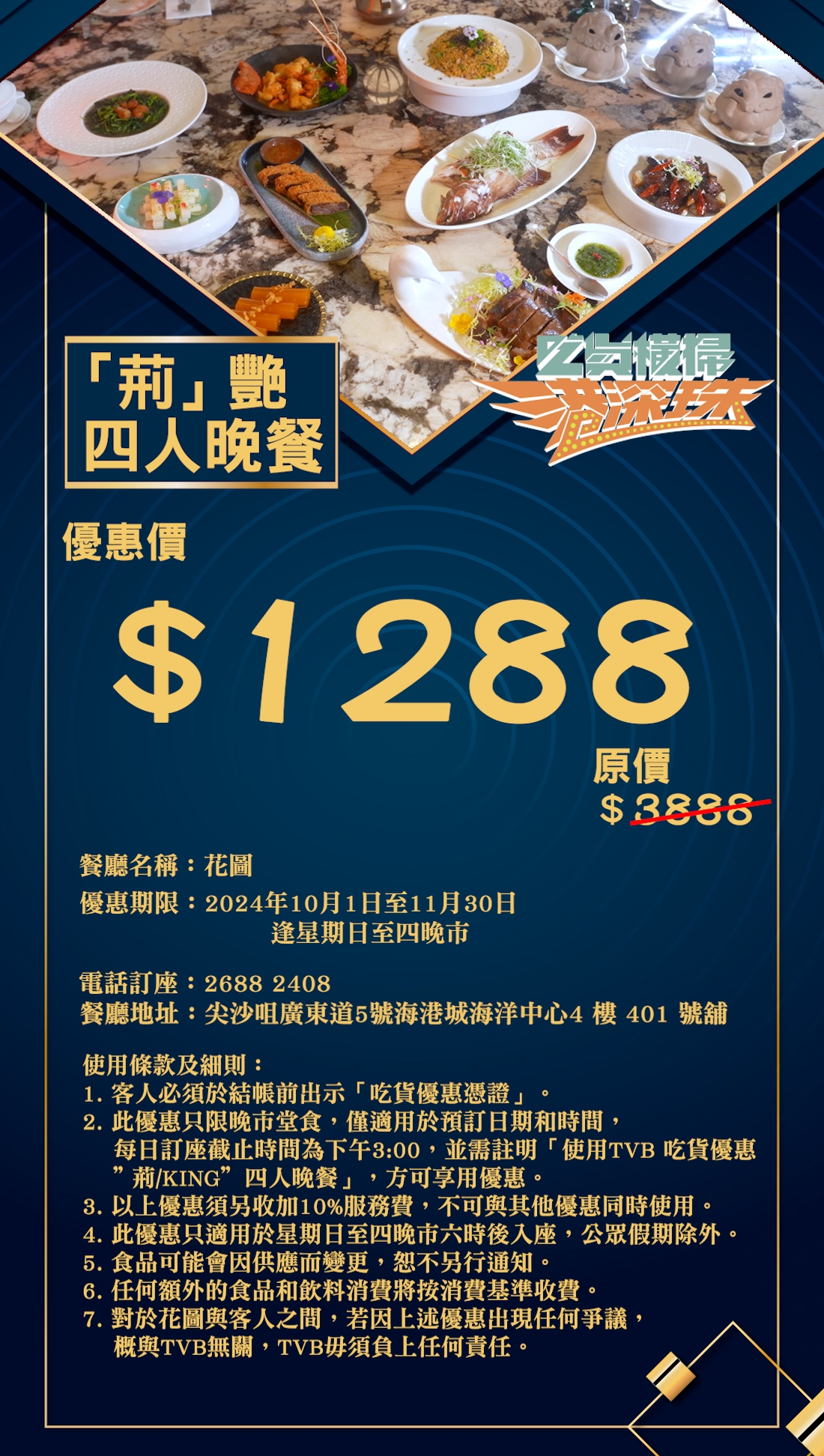 2. 此優惠只限晚市堂食,僅適用於預訂日期和時間,每日訂座截止時間為下午3:00,並需註明「使用TVB 吃貨優惠”荊/KING”四人晚餐」,方可享用優惠。