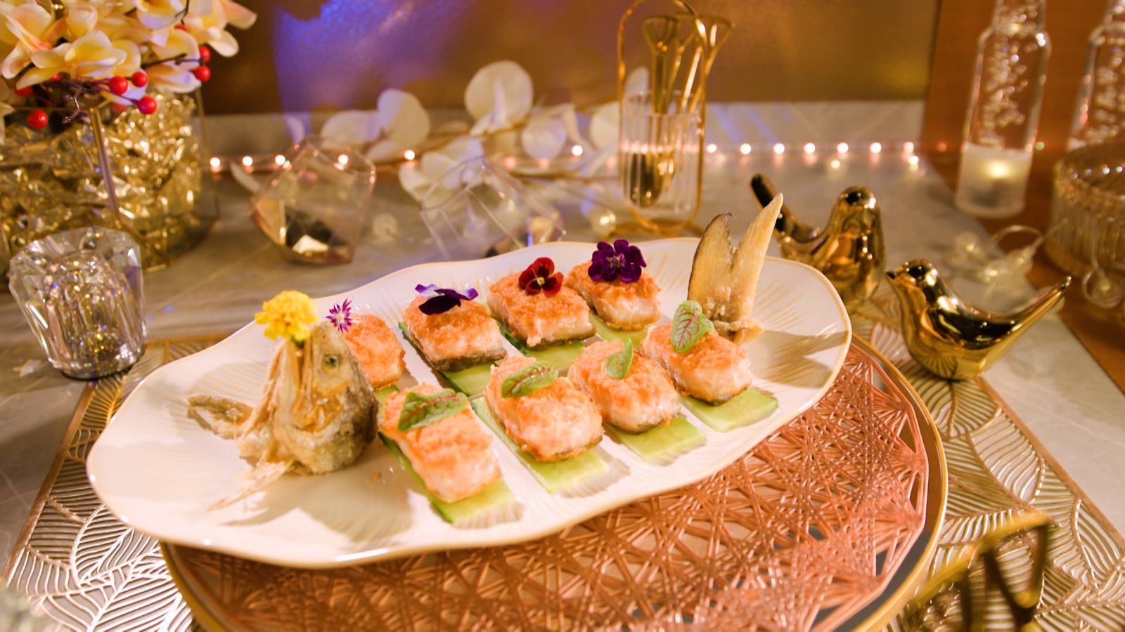 7) 落碟砌好成魚型,放上食用花裝飾即可!