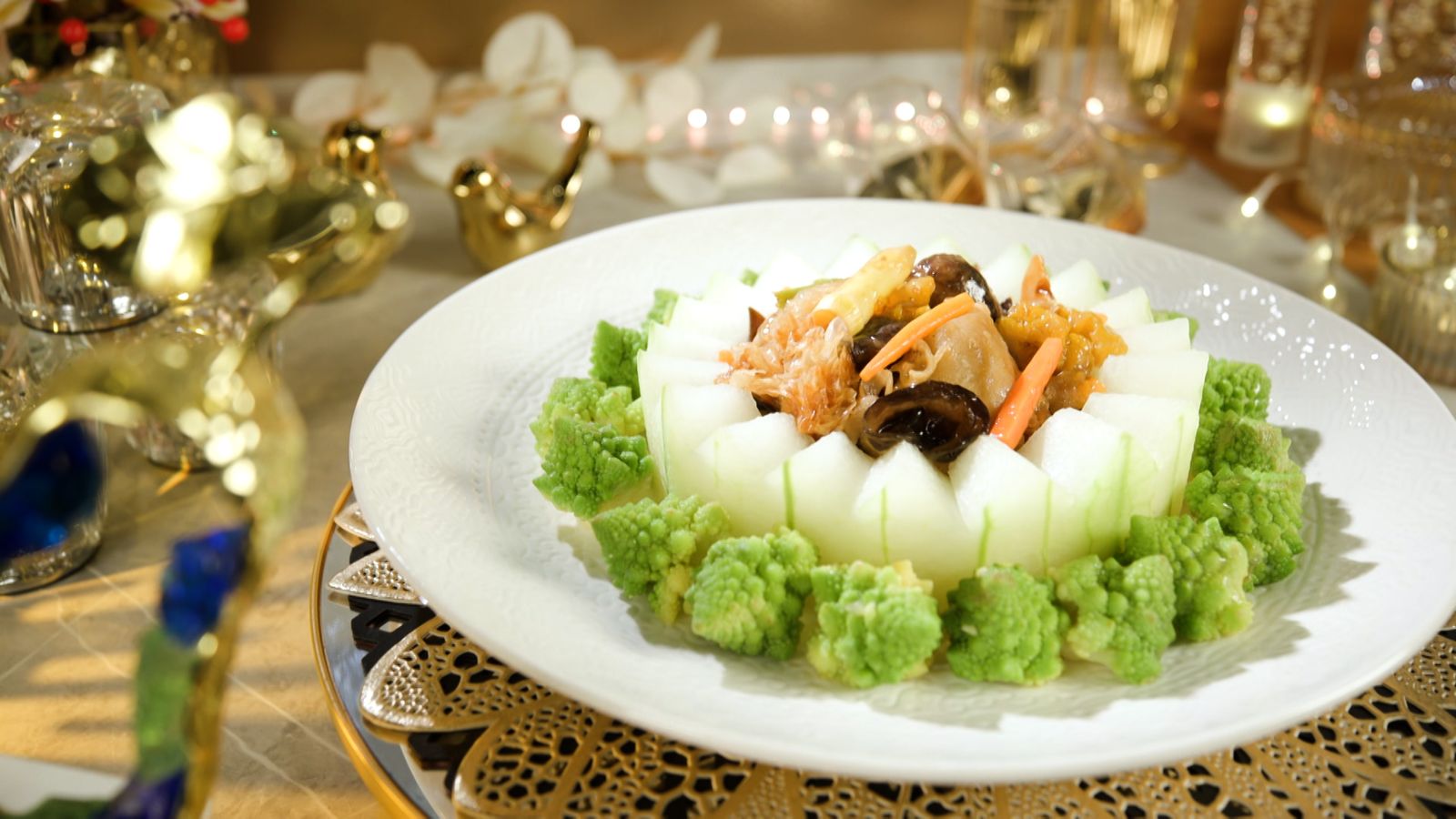 7) 回鑊炒 B 材料至熱透,加入三菇等及小許湯汁,加入調味,勾濕生粉芡,落冬瓜圈中即可!