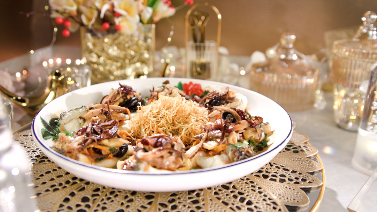 5) 魚塊放碟上排好,將肉絲、雲耳、蟲草花、陳皮及紅棗放魚面,下少許鹽調味