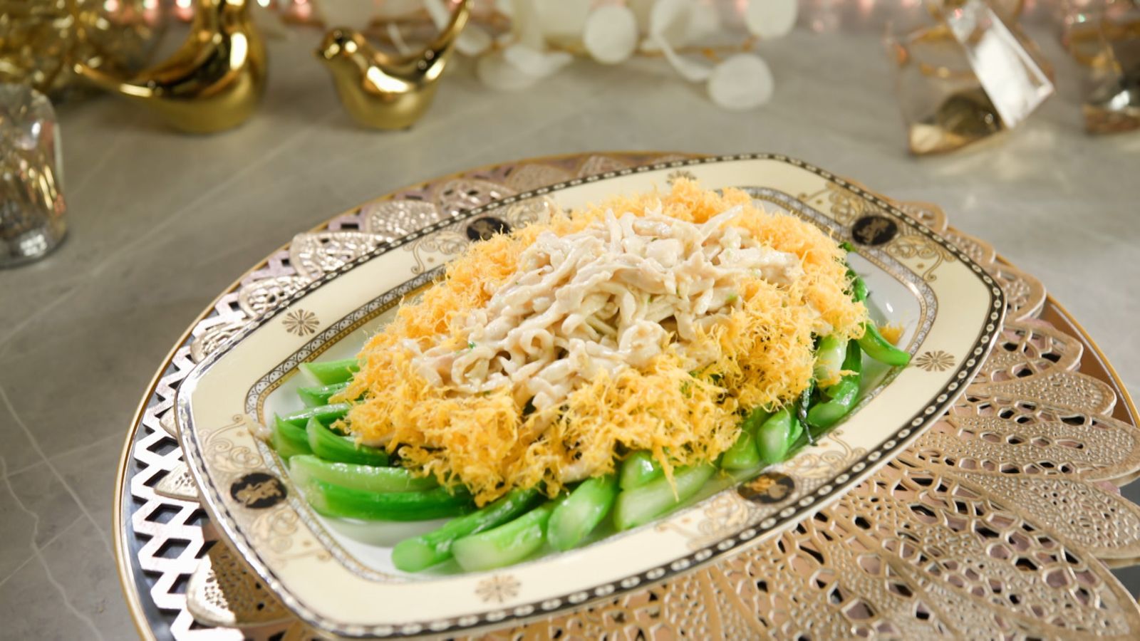 1) 鮮雞起胸肉、去除筋膜、切 3 毫米細絲、加入鹽、糖、蛋白、少許生粉及水撈勻,最後少許生油備用
