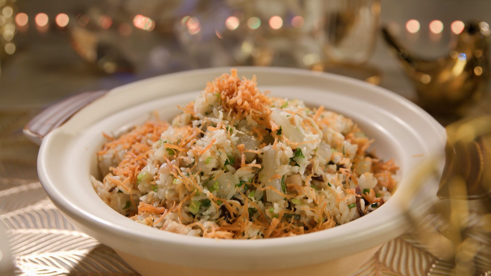 5) 再落蛋白,菜甫、方魚末同爆, 後落白飯炒均,之後加入煮好的蘿蔔炒勻後下調味料 ,最後分數次下適量上湯煨飯