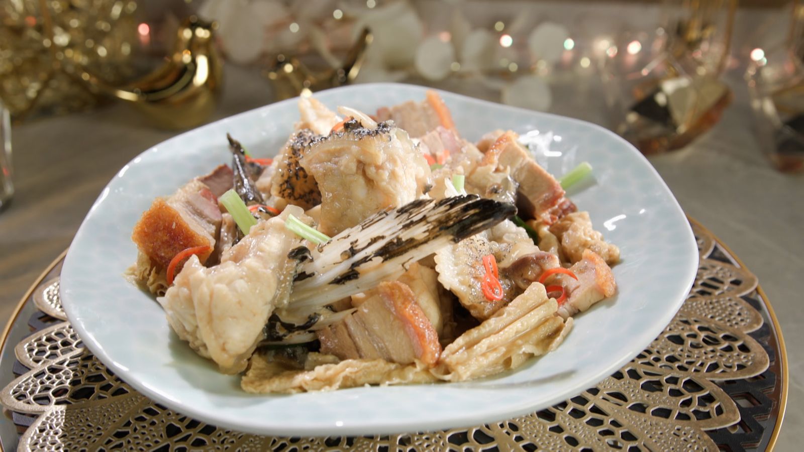 6) 下枝竹、豆卜、下調味再煮約 10 分鐘, 下唐芹及青蔥上碟