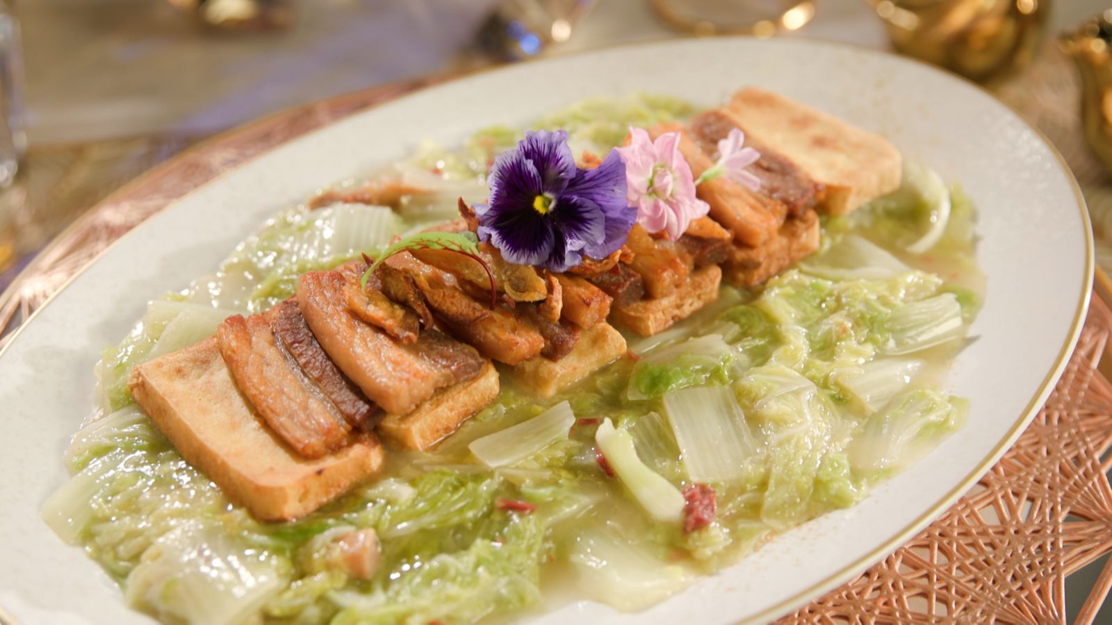 8) 留油鑊落碎鹹豬肉半煎炸至出油,落金華火腿及津白菜炒均,落上湯,魚露, 加鑊蓋燜至津白菜腍,落調味,勾濕生粉芡落碟。