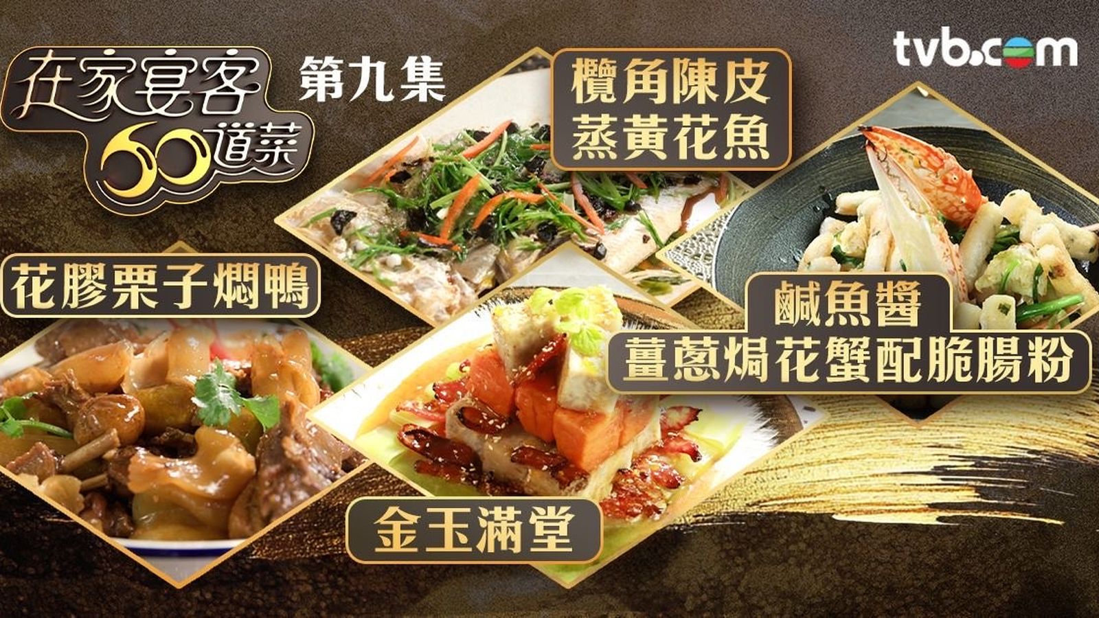 在家宴客60道菜第九集|《在家宴客60道菜》第九集中,肥媽、邵德龍師傅、李家鼎鼎爺、許美德師傅分別示範了4款不同的菜式,包括欖角陳皮蒸黃花魚、鹹魚醬薑蔥焗花蟹配脆腸粉、花膠栗子燜鴨、金玉滿堂!