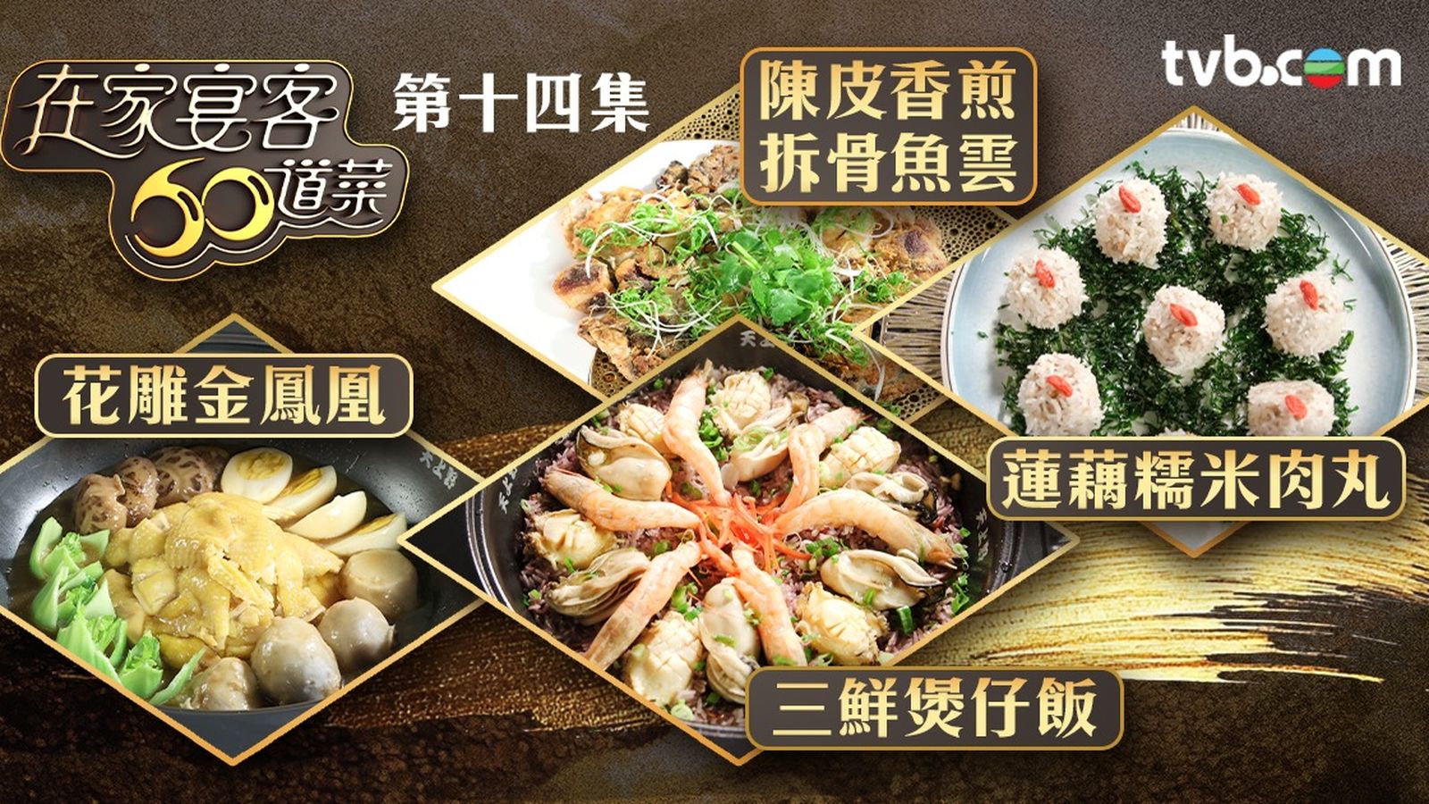 在家宴客60道菜第十四集|《在家宴客60道菜》第14集中,邵德龍師傅、肥媽、李文星師傅、李家鼎鼎爺分別示範了4款不同的菜式,包括陳皮香煎拆骨魚雲、蓮藕糯米肉丸、花雕金鳳凰、三鮮煲仔飯!