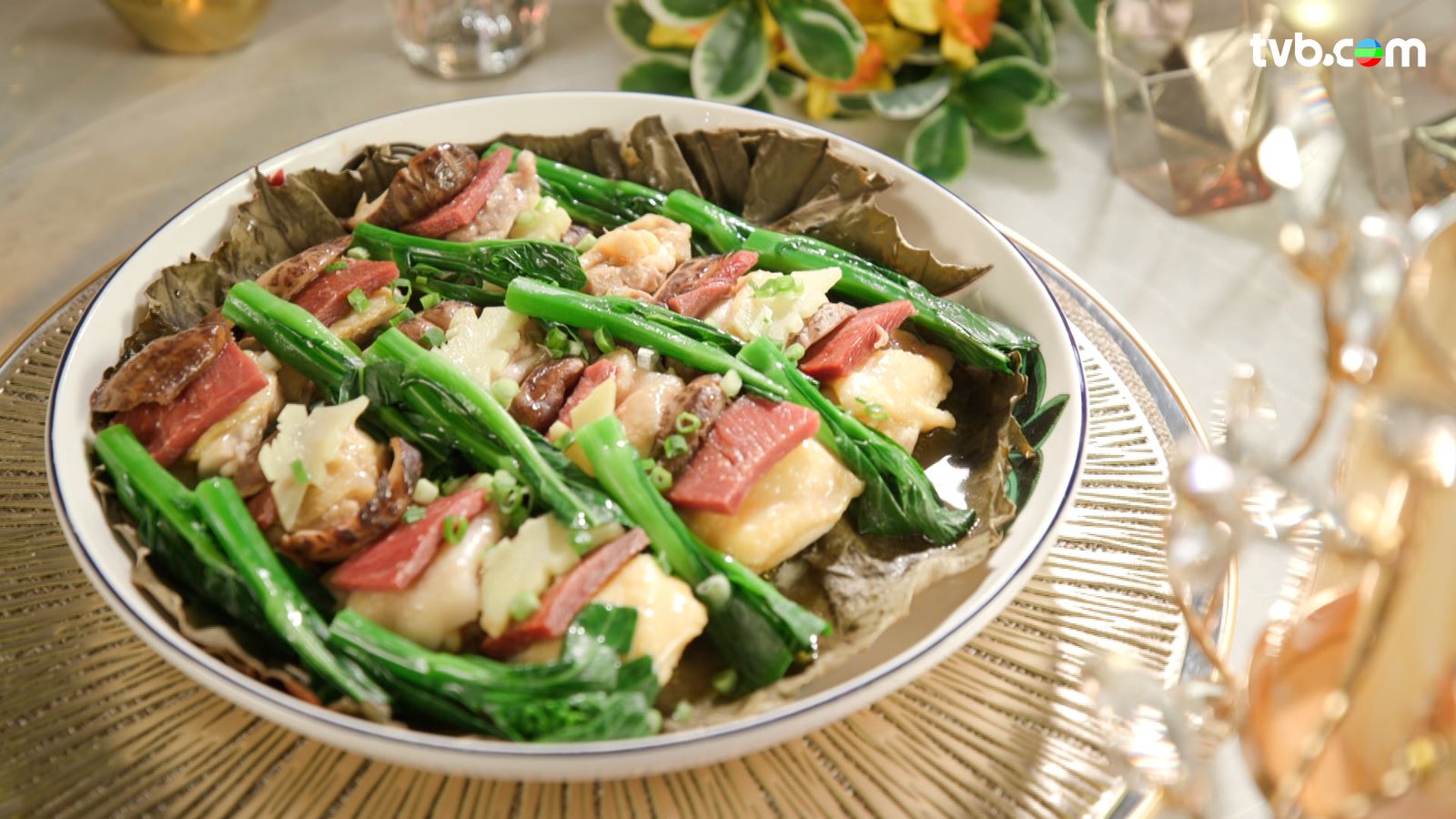 - 準備橢圓長碟,鋪荷葉,避開硬梗、雞髀肉片、金華火腿片、冬菰片梅花間竹排成骨牌狀