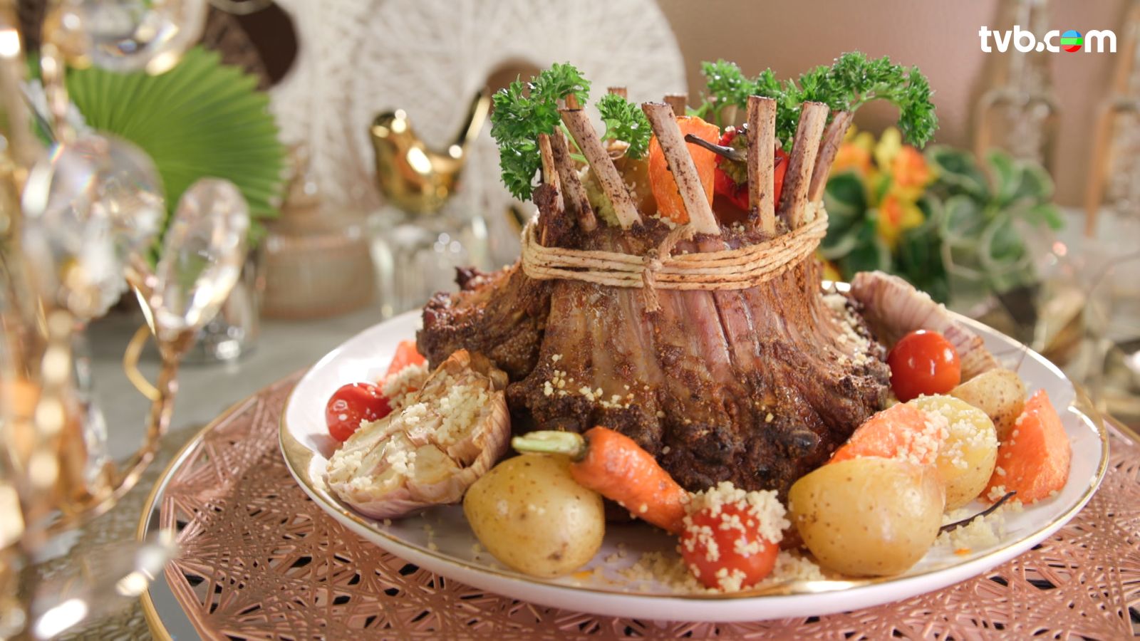 - 兩排羊架,脂肪向內,用綿繩綁住羊骨部分成皇冠狀