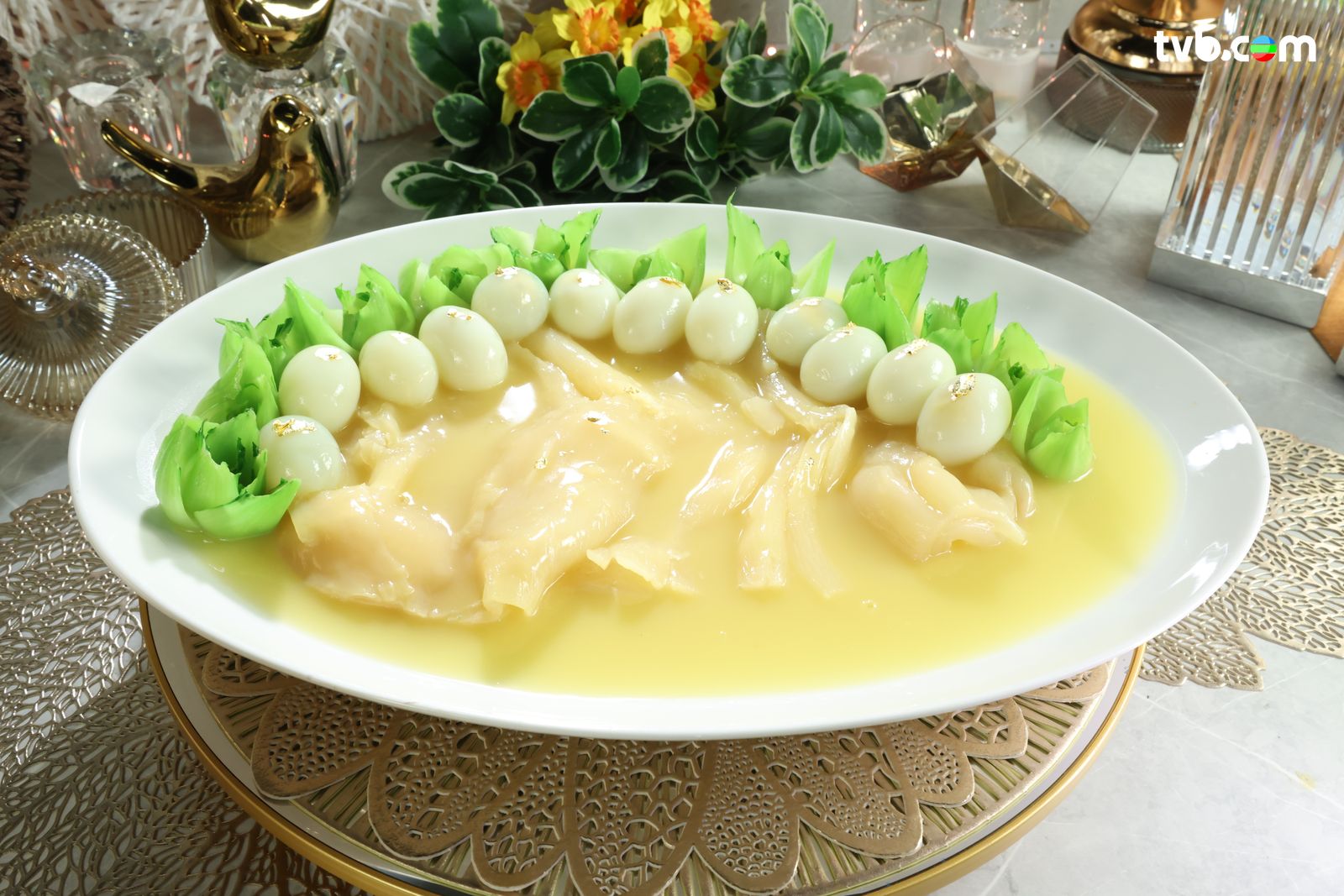 - 鴿蛋及小棠菜花回鑊,收汁,再淋於花膠,灑上金箔完成。
