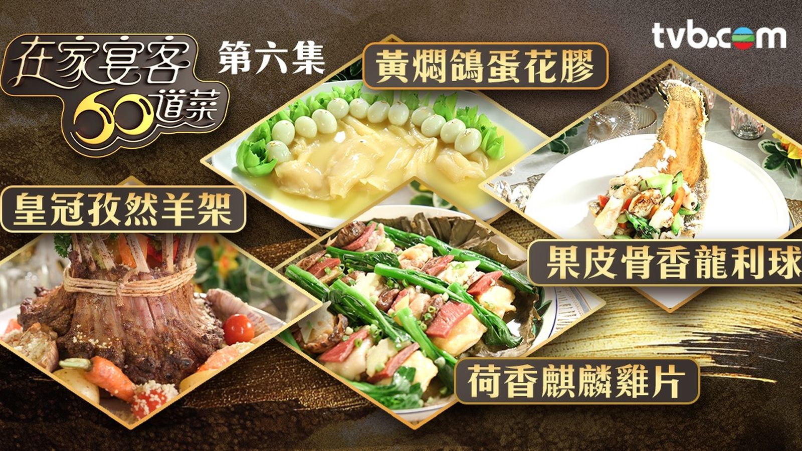 在家宴客60道菜第六集|《在家宴客60道菜》第六集中,繼續有邵德龍師傅、李文星師傅、肥媽、李家鼎鼎爺教煮餸,今次會有黃燜鴿蛋花膠、果皮骨香龍利球、皇冠孜然羊架、荷香麒麟雞片!