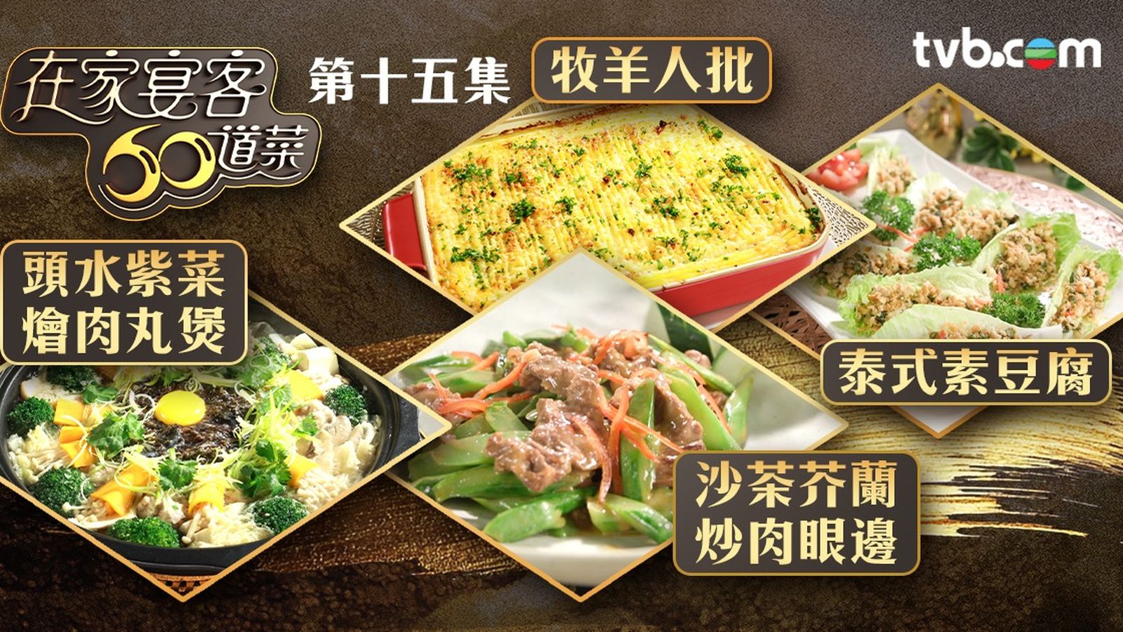 在家宴客60道菜第十五集|《在家宴客60道菜》第十五集中,Jacques Kagi、肥媽、許美德師傅、李家鼎鼎爺煮出不同的菜式,包括牧羊人批、泰式素豆腐、頭水紫菜燴肉丸煲、沙茶芥蘭炒肉眼邊!