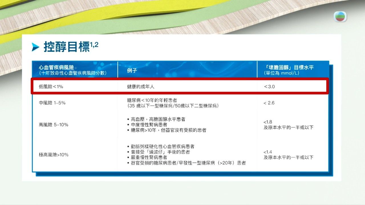 健康成年人的壞膽固醇理想水平數字為3.0 mmol/L以下;如果病人有高危風險(包括糖尿病、接受「通波仔」手術、中風),壞膽固醇目標水平數應為1.4 mmol/L以下。