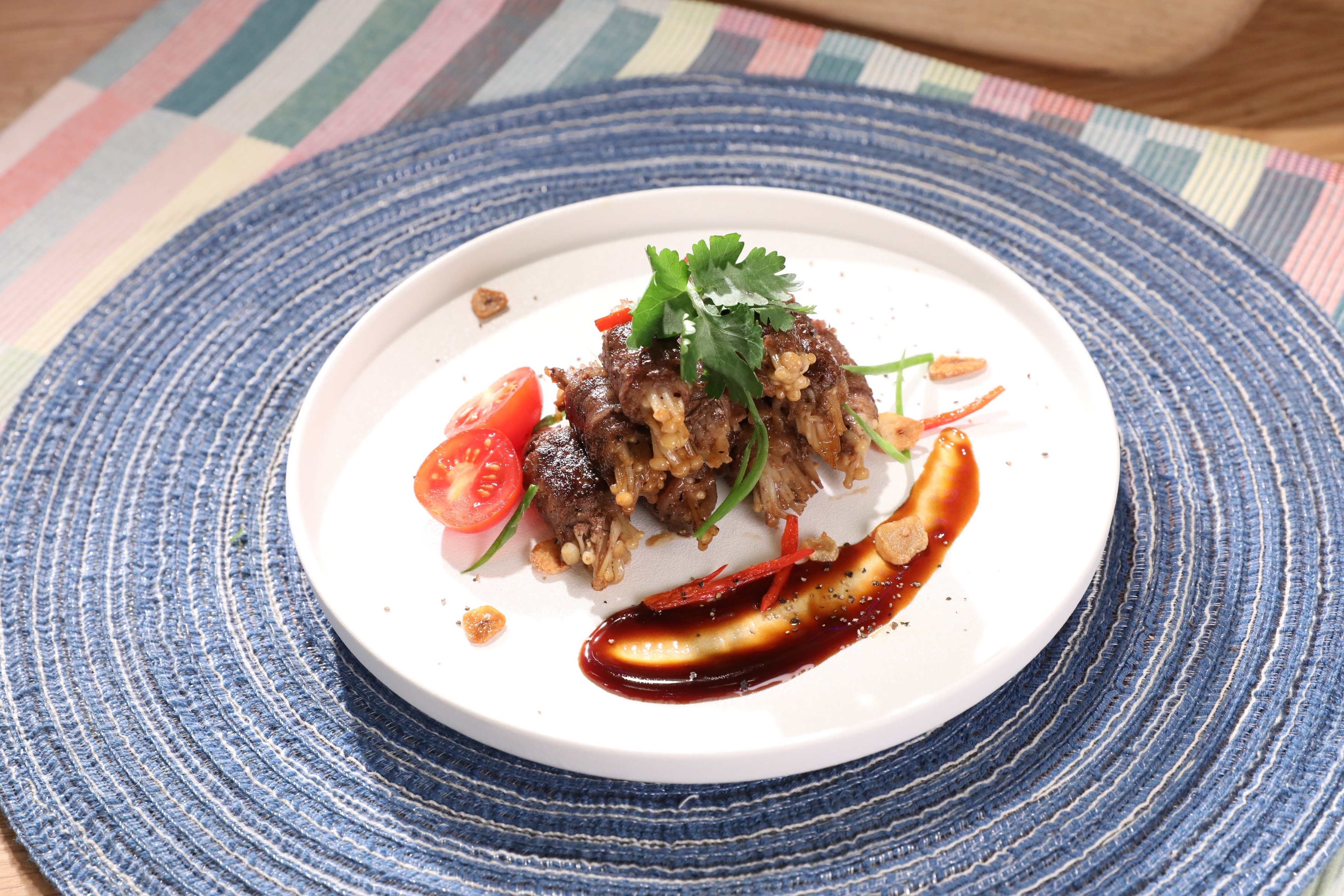 2. 肥牛攤平放入金菇捲起