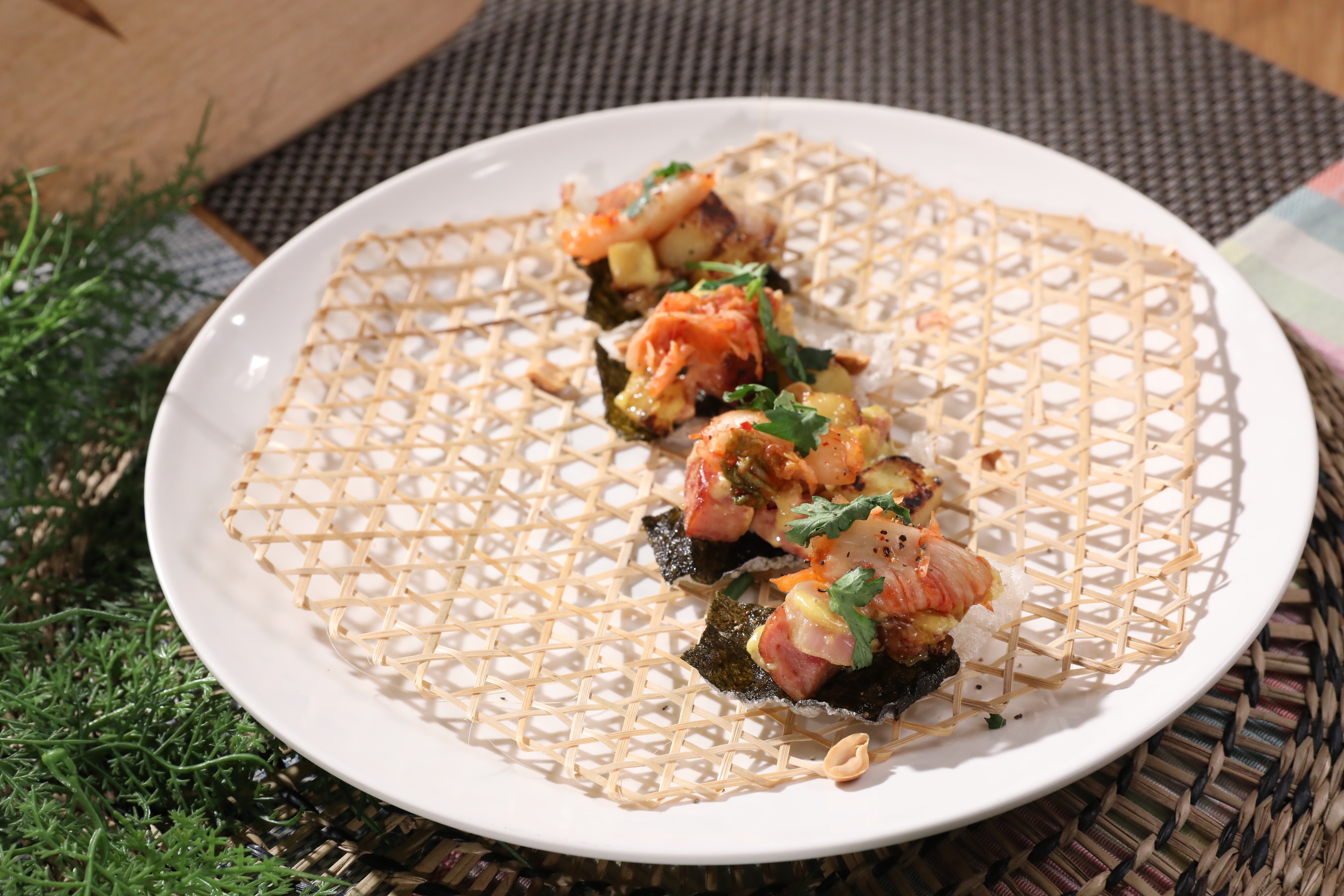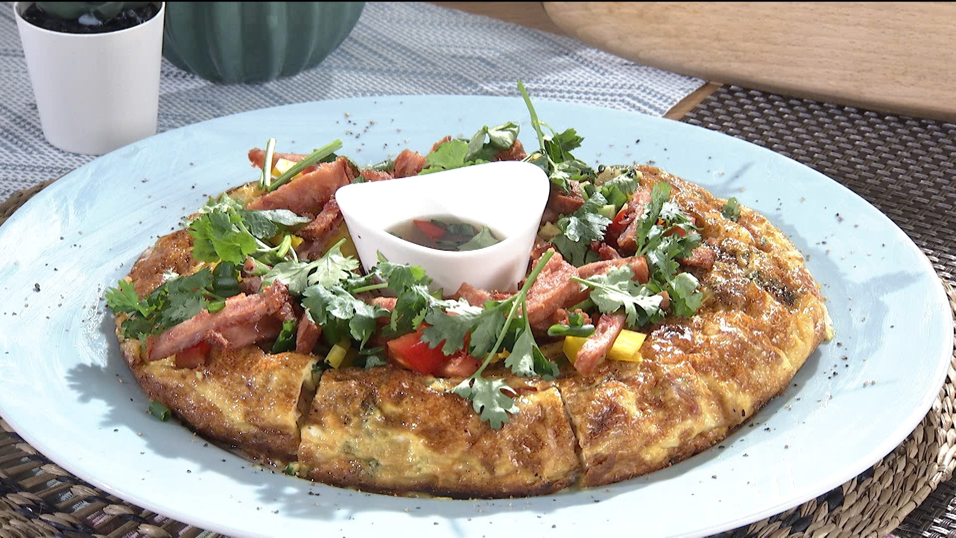 11. 煎好後裝盤,平均切成8等份,放上芫茜,蔥,三色椒裝飾