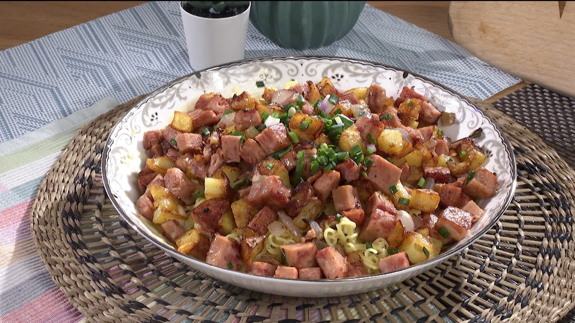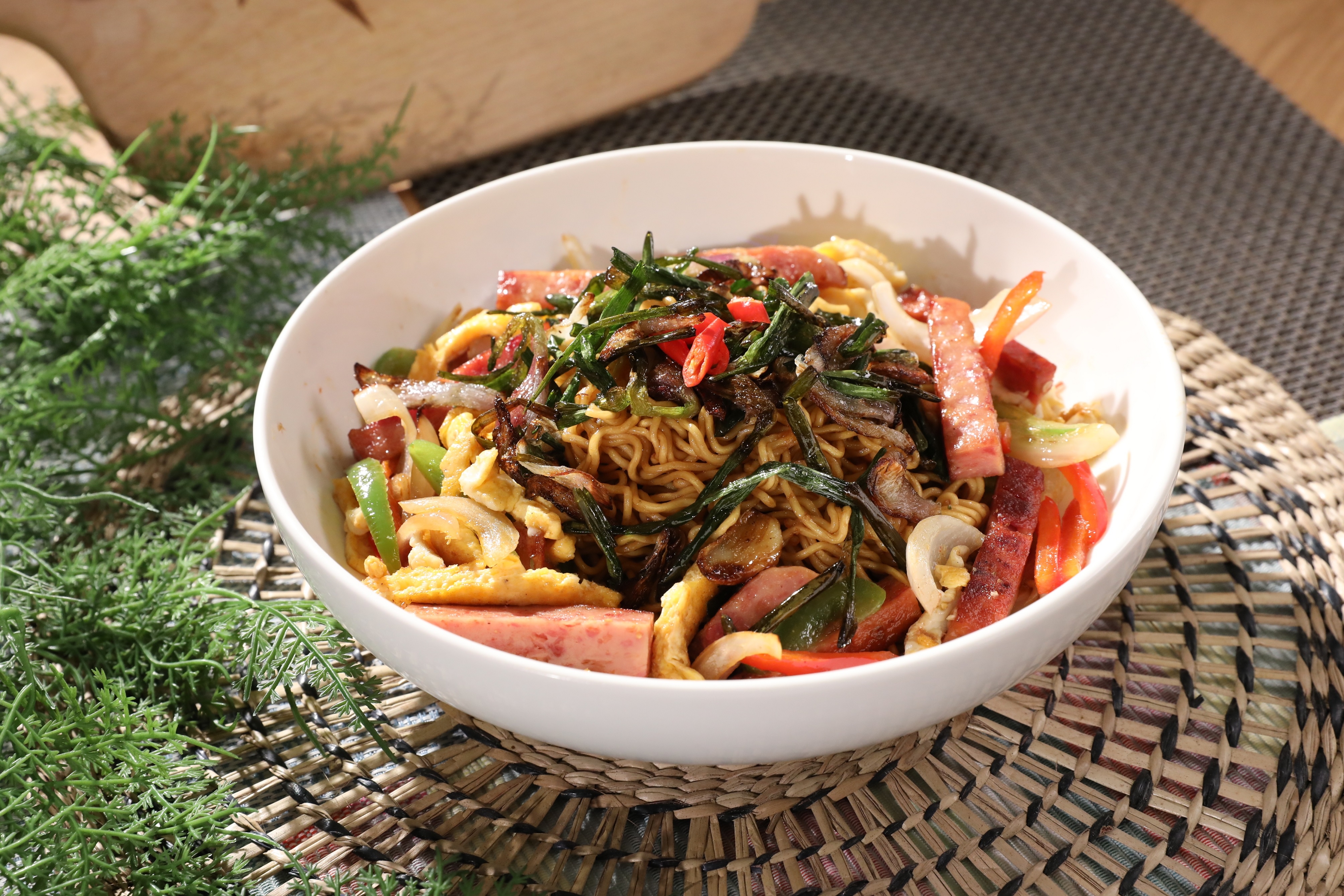 8. 將芝士汁淋在即食麵,加入薯仔午餐肉粒,即成!