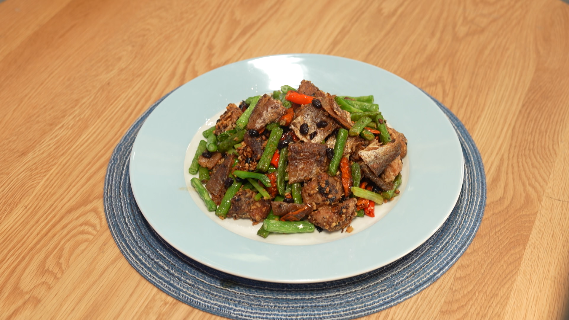 9. 加入炸一口骨、炸四季豆及辣椒乾兜勻