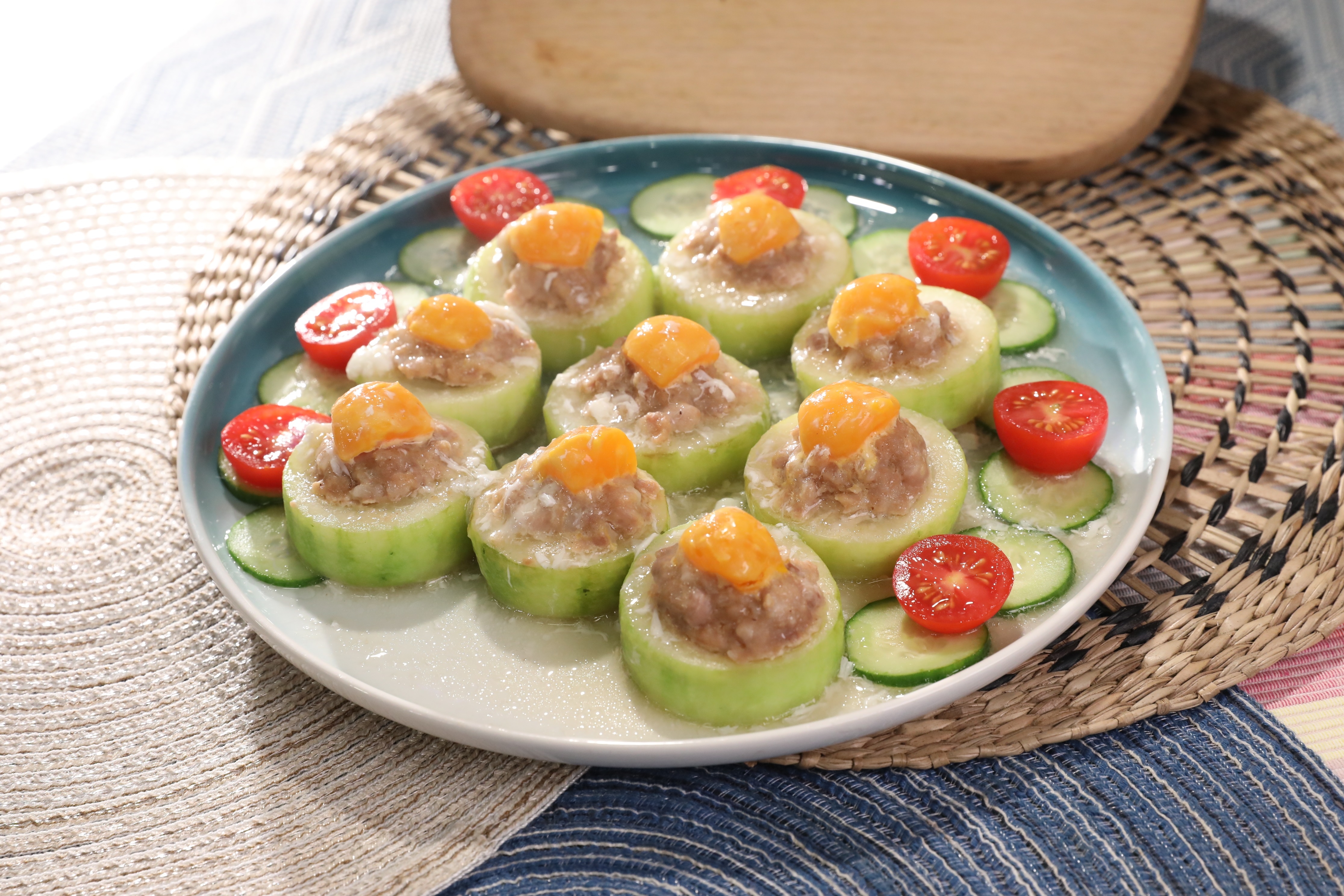 5. 將鹹蛋去白留黃,切成粒狀,放上釀好的玉環,大火蒸12分鐘後關火,再焗三分鐘(勿揭蓋)