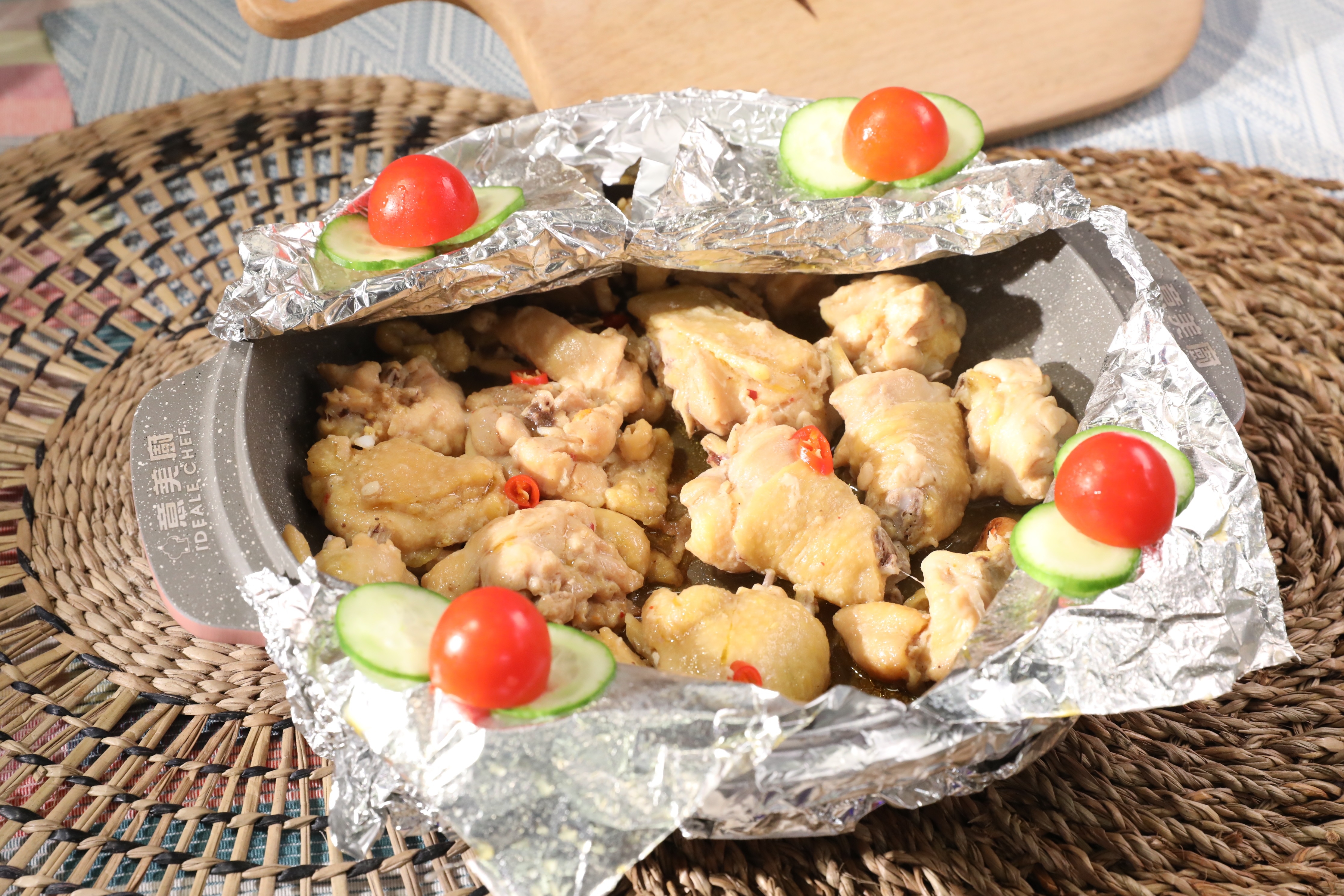 8. 以中火煎焗雞件至見到白煙及錫紙漲起,約6-8分鐘,熄火焗五分鐘,完成