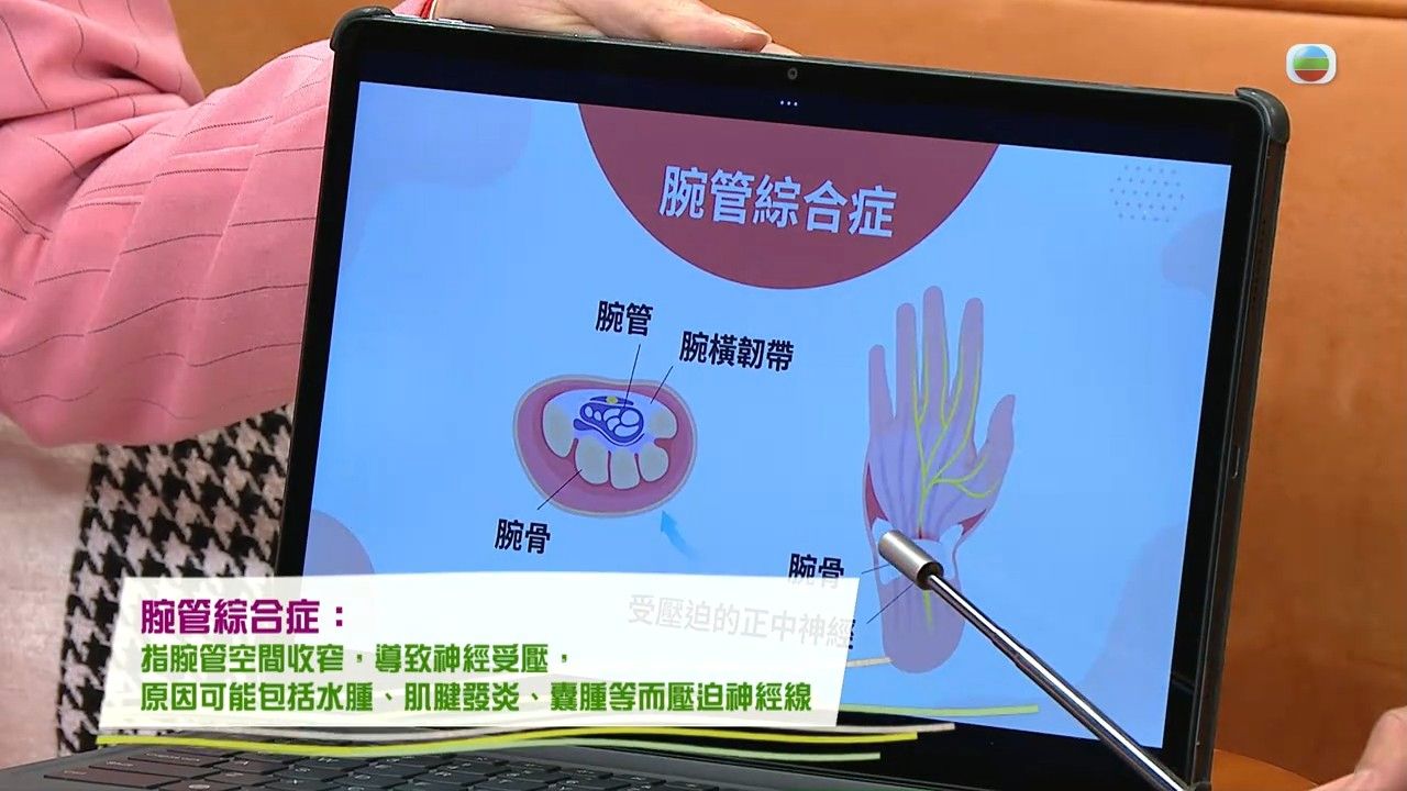 腕管綜合症是指腕管空間收窄,導致神經受壓,原因可能包括水腫、肌腱發炎、囊腫等而壓迫神經線。輕微會有麻痺感,嚴重栺姆指肌肉可能萎縮。