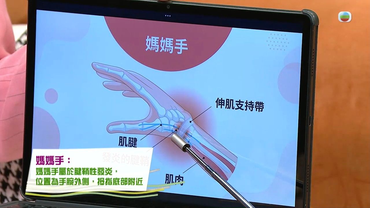 「媽媽手」屬於腱鞘性發炎,痛楚位置為手腕外側,拇指底部附近。