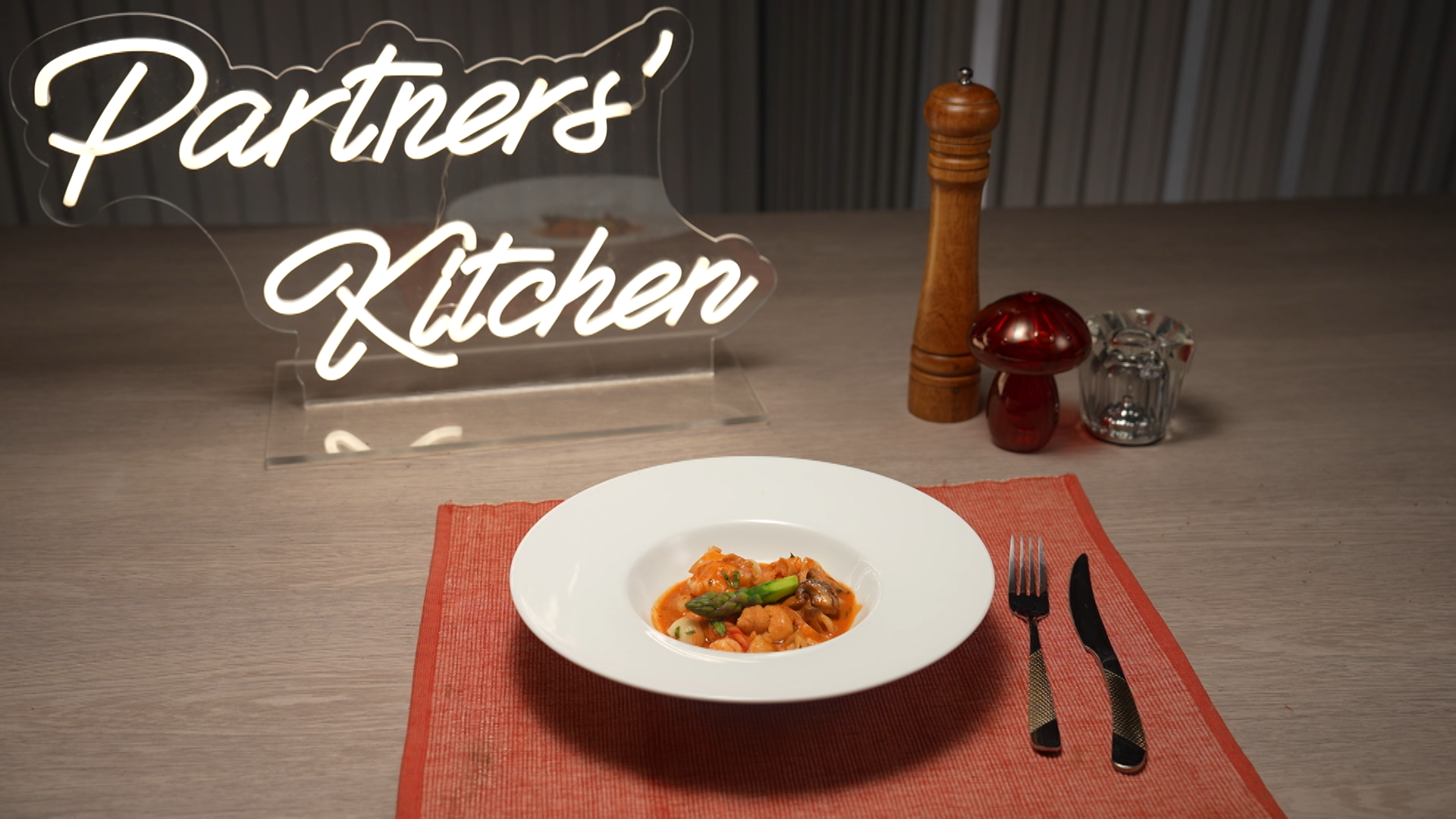 5. 原鑊加熱,洋蔥、羅勒、白酒,些厘酒,紅蝦汁和忌廉,煮1分鐘。將意大利通粉加入鑊內,再放紅蝦肉和象拔蚌,輕烚青蘆筍,上碟。