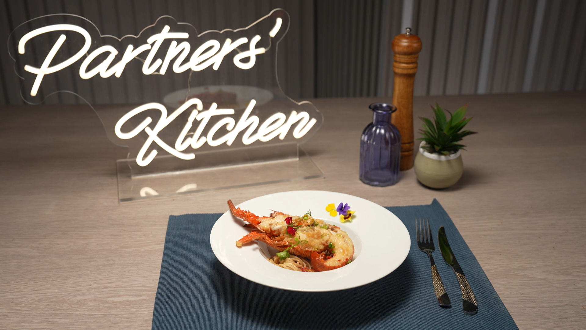 6. 再爆香1份各10克/毫升牛油、薑茸、蒜茸、蔥花、泰式蟹頭油,倒入餘下上湯及清水各200毫升,加入龍蝦,加入少許調味,煮3-4分鐘埋芡放上伊麵完成